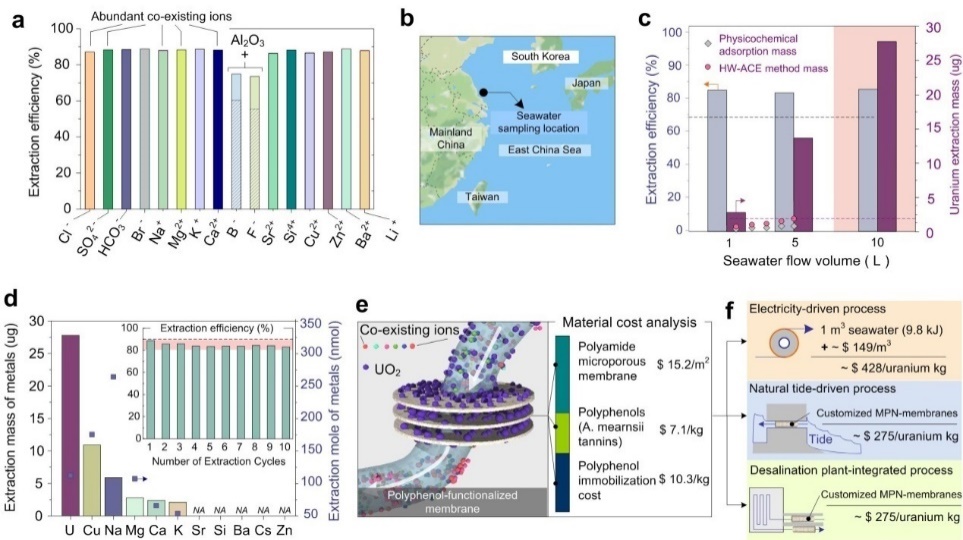Nuclear fuel uranium plays an increasingly important role in China's national economy and national defense construction. The large-scale development and utilization of nuclear energy have become an inevitable choice with the rapid development of China's economy and the depletion of global fossil energy. Roughly 4.5 billion tons of uranium exists in the ocean, which is 2,000 times more than the amount of uranium found on land. If uranium can be extracted effectively from the ocean, it can provide a nearly inexhaustible supply for nuclear power production. However, the extraction of uranium from seawater is highly challenging due the background high salinity and uranium’s relatively low concentration. Developing high-selective and large-flow separation materials and reducing costs is a difficult point in the development of uranium capture from seawater.