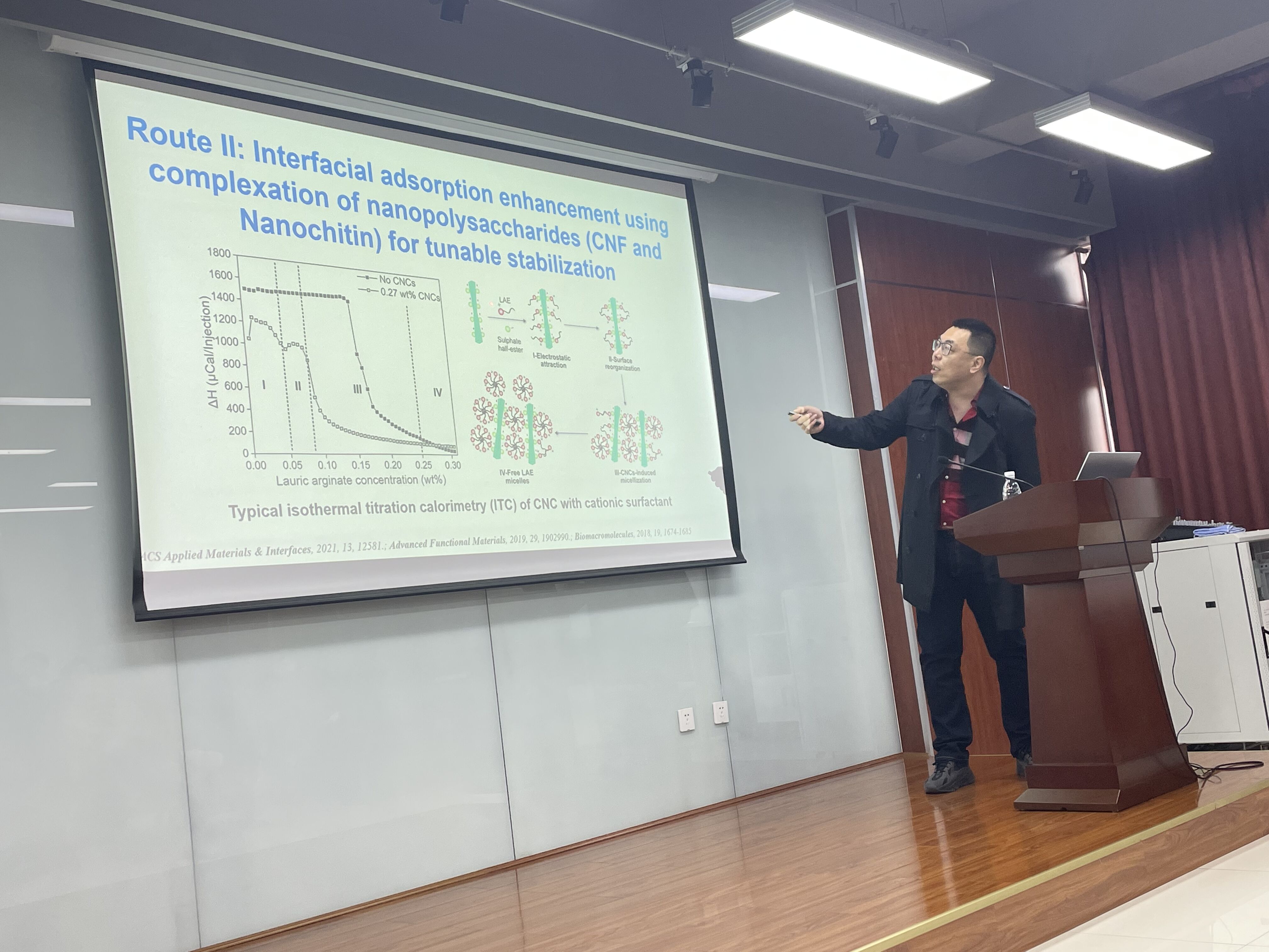 白龙教授以“林木生物质非均相限域转化与功能应用”为主题,从“生物质Pickering乳液制备”、“生物质Pickering乳液界面机理研究”、“生物质Pickering乳液3D打印”、“应用展望”四个部分进行重点讲授。