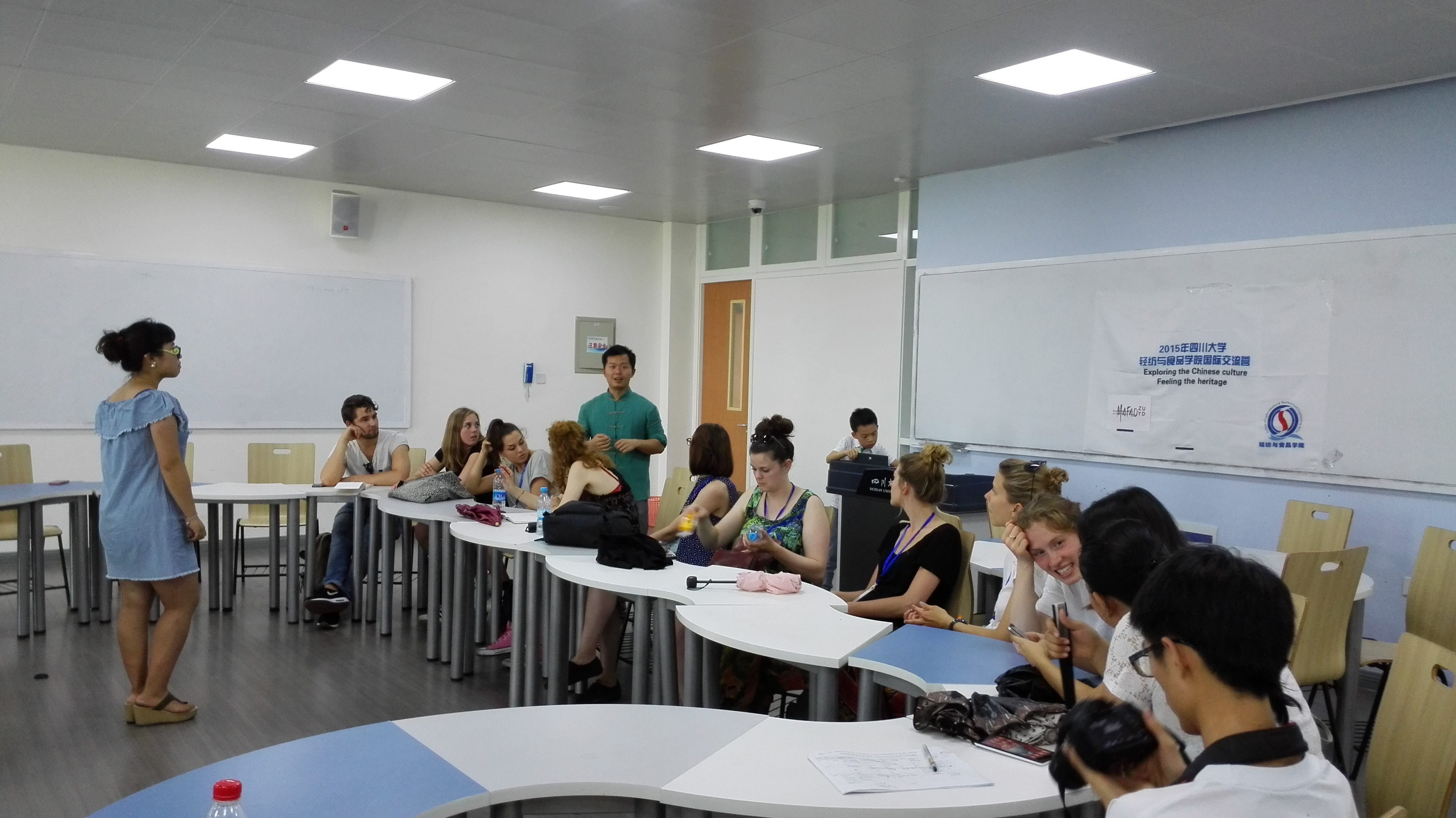 2015年7月5日,四川大学轻纺与食品学院与荷兰南方应用科技大学马斯特里赫特美术与设计学院(the Maastricht Academy of Fine Arts & Design Study part of Zuyd University)两校间的国际交流营活动正式启动。经过一天的交流互动,我院2012级和2013级的交流营志愿者同荷兰的9名同学产生了浓厚的情谊,为接下来一周的交流活动打下了良好的基础。早上9点,在祝蔚老师的带领下,交流营员从北门荷花池开始参观望江校区。途经体育馆、文化大道、张澜路、校史博物馆、东门荷塘等, 10点30分,交流营员开始参观四川大学博物馆,并对其中的展品产生了浓厚兴趣,尤其是少数民族服饰。下午13点30分,一行人抵达江安校区。首先,邀请Zuyd University的9名交流生去邮寄寄送明信片;然后交流营到达综合楼B508进行面对面的交流,并对此次交流活动的日程安排进行讲解和调整。在此次面对面交流中,双方就接下来的日程安排进行商讨并达成一致。会面中大家对上午的参观进行了深度的交流,双方在互动中产生了浓厚的情谊。