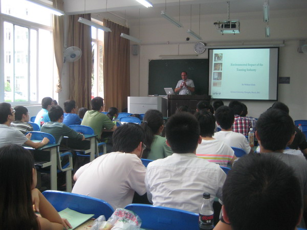 轻纺与食品学院、制革清洁技术国家工程实验室聘请的讲座教授Wolfram Scholz 博士开始给轻化工程专业2011级、2010级本科生授课。2013年9月17日和24日,Wolfram Scholz博士分别给2011级轻化工程专业学生讲授了“制革概论(全英文)”课程。他讲课的主题是“Environmental Impact of the Leather Industry and overview of environmental technologies for tannery wastewater treatment”。在课件休息时间,Wolfram Scholz 博士与同学们进行了交流。