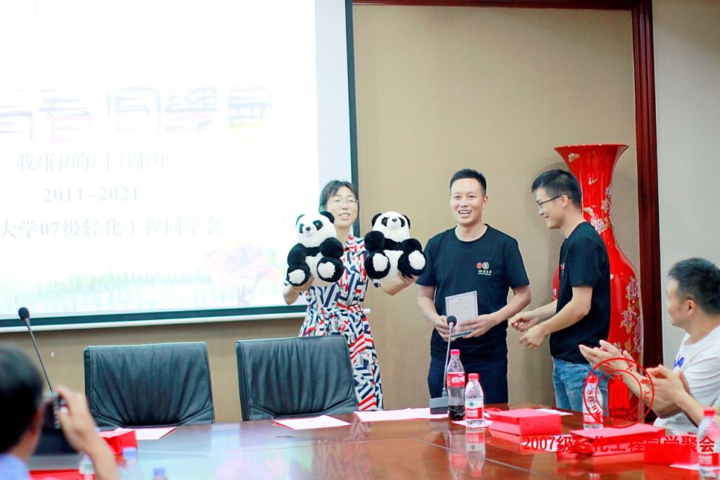 程自强及刘强代表2007级轻化工程校友赠送皮革系纪念礼物—“熊猫大使”,生物质与皮革工程系主任林炜予以接收。该“熊猫大使”经四川大学与德华皮草产学研联合,利用四川省优质獭兔毛皮及进口水貂毛皮,并研习大熊猫相关神态习性,经创新研发,由国家裘皮加工基地匠心精制并出品裘皮真毛熊猫系列文化艺品。其核心技术获得四川省科技进步一等奖。此次馈赠皮革系两只裘皮精制“熊猫大使”,见证老师与学生深厚情谊,见证母校轻化工程之于裘革产业重要地位!