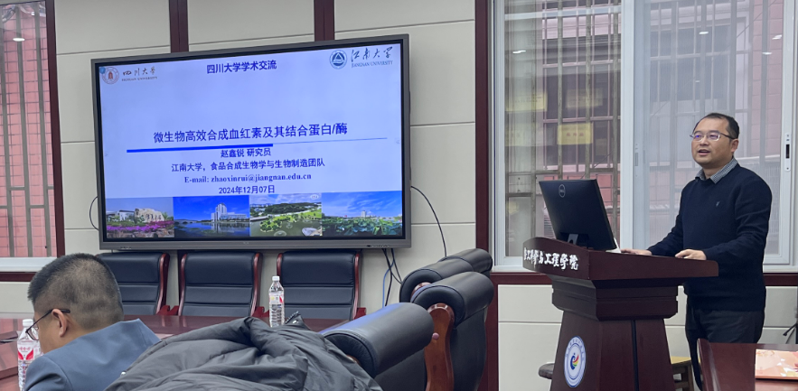 国家级青年专家、江南大学生物工程学院赵鑫锐研究员作题为“微生物高效合成血红素及其结合蛋白”的报告。血红素是一种含铁的四吡咯化合物,广泛存在于血红蛋白、肌红蛋白、过氧化氢酶、细胞色素c和细胞色素P450中,并在生物体内执行许多重要的生理功能。赵鑫锐研究员团队通过代谢工程手段,在大肠杆菌和酵母等微生物中构建了高效的血红素生产平台,并通过比较转录组学开发血红素生物传感器实现了血红素蛋白的高产。