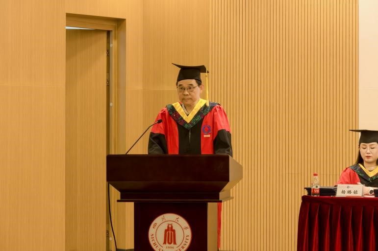 学院学位评定分委员会主席、院长彭必雨教授致辞。他勉励全体毕业生:“要将青春梦想熔铸于民族复兴的伟大征程,用奋斗的笔墨书写属于新时代的人生华章。”面向未来,彭院长以师者之心提出殷切嘱托:第一,永葆赤子之心,做胸怀家国的追梦者,让个人理想与时代脉搏同频共振;第二,秉持求实精神,做知行合一的实干家,以深厚的专业积淀和全球化的视野格局赢得出彩人生;第三,勇立时代潮头,做敢为人先的开拓者,以创新思维引领行业发展,书写属于自己的精彩篇章。