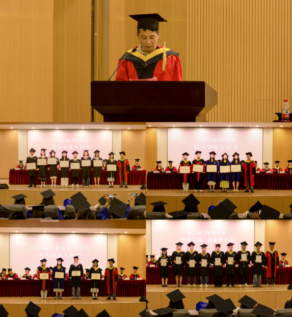 学院党委书记李天富宣读了《9428cn太阳集团古天乐2025届省优秀毕业生名单》《2025届毕业生校友工作年级联络人聘任决定》和《四川大学热爱专业—就业奖学金》表彰文件。李书记和彭院长一同为获奖学生颁发证书。