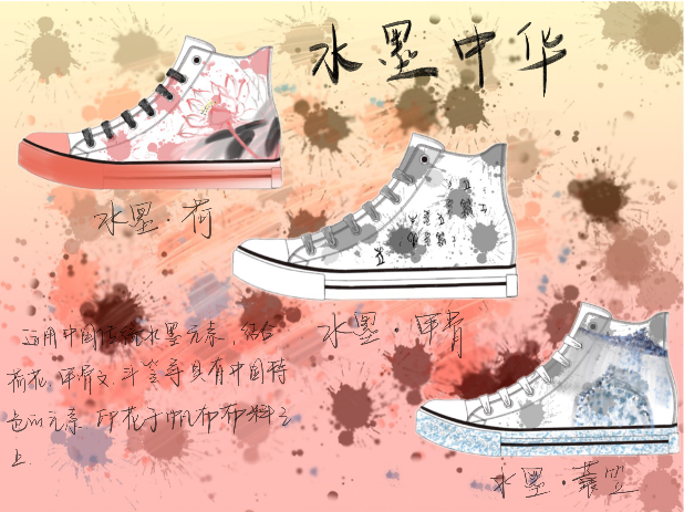 在《鞋类设计与开发》部分的课后作业中,姚云鹤老师也增加了“在设计中融入中华传统文化元素”的内容,引导同学们在课程学习的基础上进行深入思考,在设计实践中融入中华传统文化元素。同学们纷纷在设计图稿中融入中华传统文化的元素,设计出了各具特色的中国风鞋子。