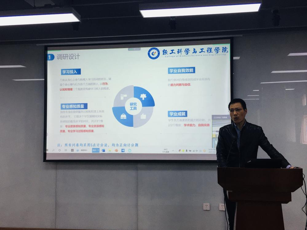 冯国涛副书记向与会人员介绍了针对创新班和对应普通班同学开展的问卷调研和个别访谈结果,并从学习投入、专业感知质量、学业自我效能、学业成就四个维度对调研结果进行了分析,为下一步工作开展思路提供了积极的建设性意见。