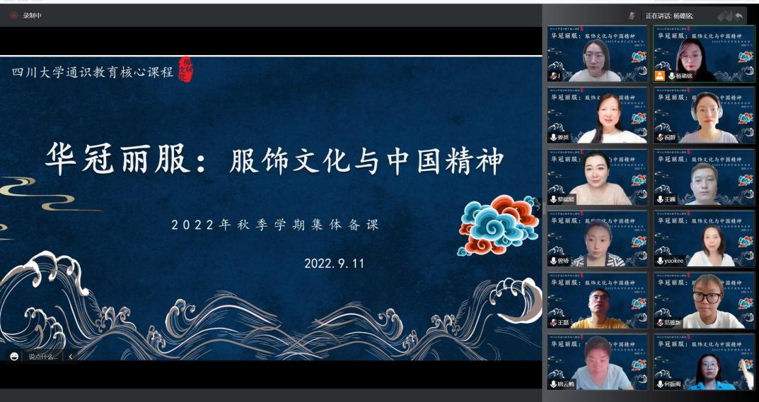 “华冠丽服:服饰文化与中国精神”是四川大学第二批通识教育核心课程,为促进课程组教师多学院、多学科的交叉融合,保证“华冠丽服:服饰文化与中国精神”课程在新一学期的顺利高效开展,便于课程组教师根据学情对课程内容及授课方式进行针对性调整,保障课程线上教学效果,课程组于2022年9月11日在腾讯会议开展本学期第一次集体备课活动。在此次活动中,课程组对本学期上课形式、课程内容、过程考核方式、期末考核标准等方面统一了思想。