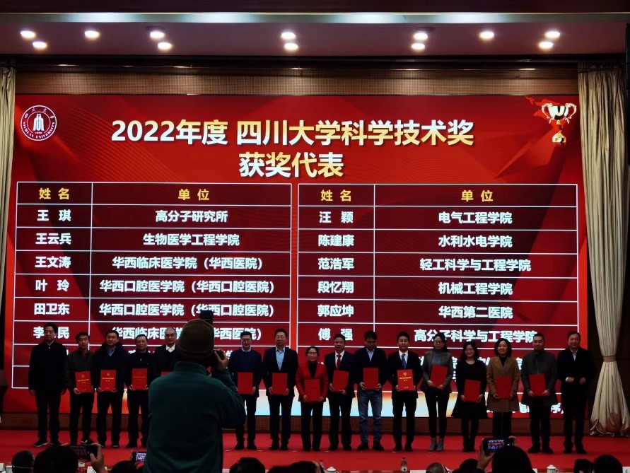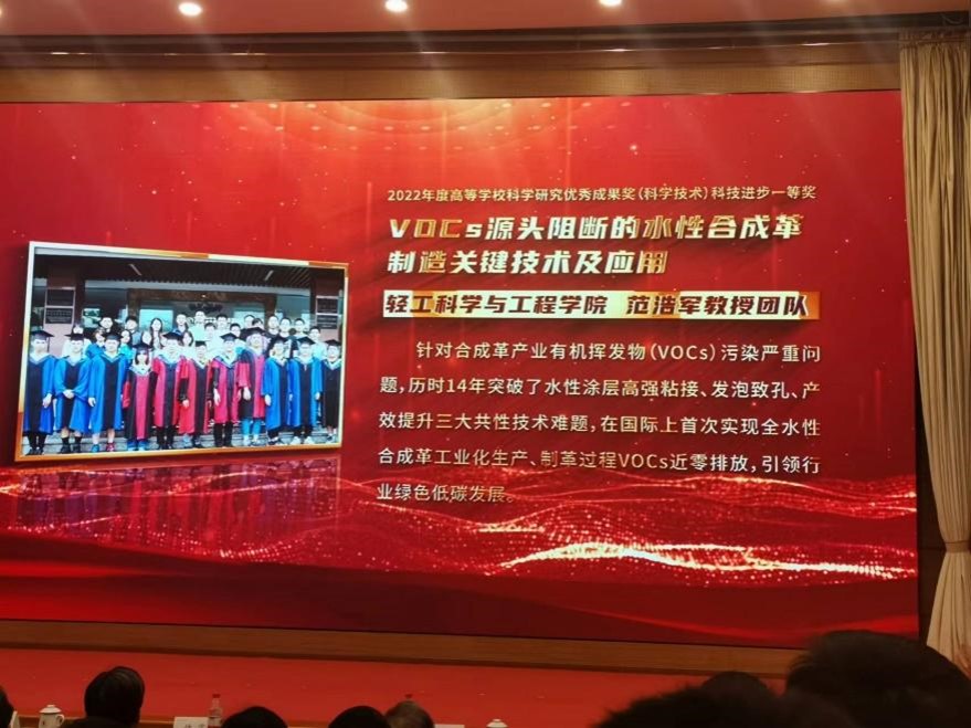2023年1月5日下午,四川大学2022年度科研工作总结大会在四川大学望江校区召开,一大批先进科研工作者受到学校表彰。9428cn太阳集团古天乐、皮革化学与工程教育部重点实验范浩军、陈意教授团队成果“VOCs源头阻断的水性合成革制造关键技术及应用”获得2022年度教育部科技进步一等奖,校长李言荣院士亲自颁奖并表示祝贺。