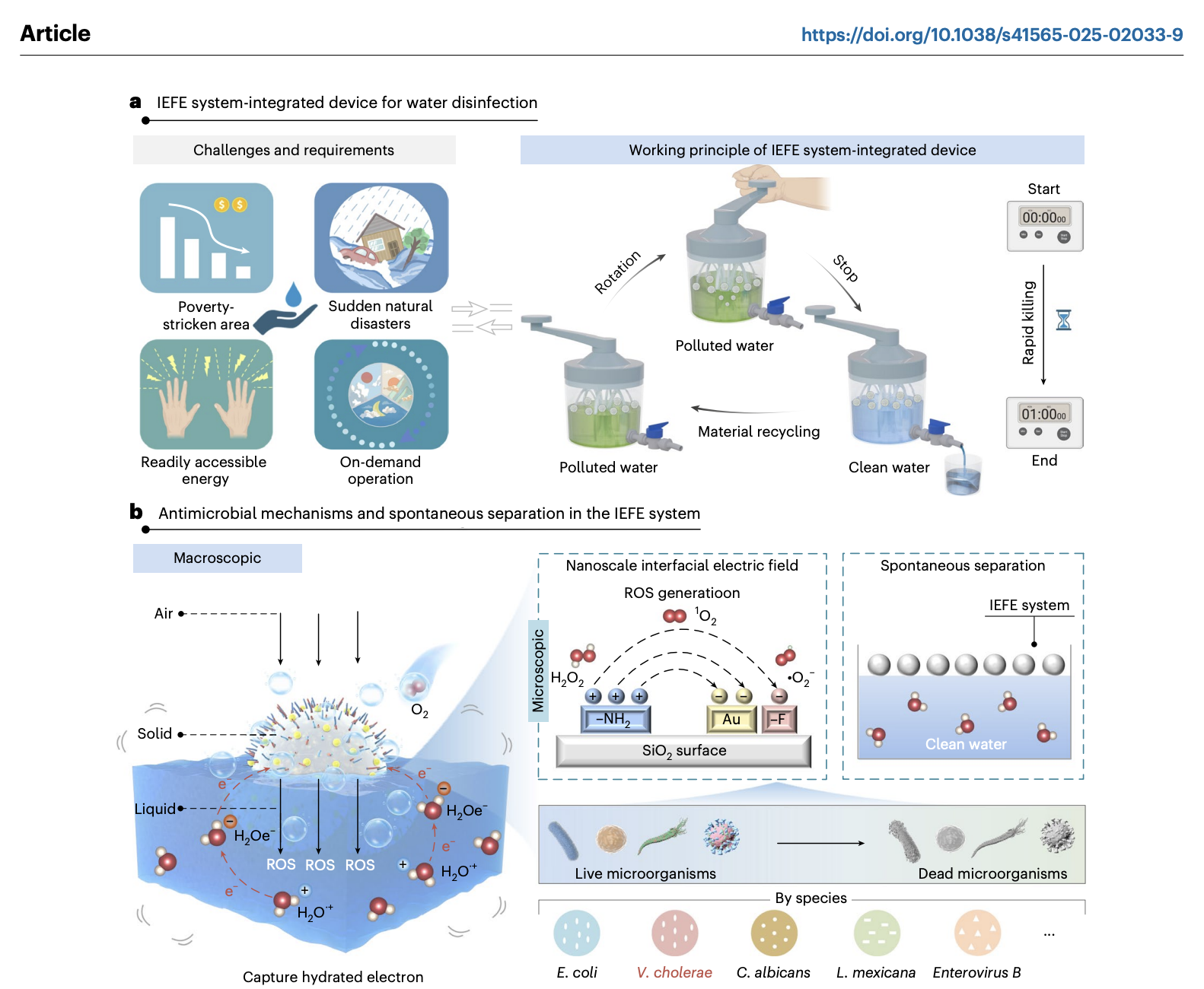 近日,我院郭俊凌教授团队联合电子科技大学邓旭教授团队与华中科技大学李岩教授团队在国际著名期刊《Nature Nanotechnology》发表了题为“Hand-powered interfacial electric-field-enhanced water disinfection system”的研究成果,并受邀撰写Research Brief进行专题报道。第一作者为电子科技大学基础与前沿研究院陈之迪博后、我院2021级博士研究生张亚静及华中科技大学同济医学院2021级博士研究生吕潘静。