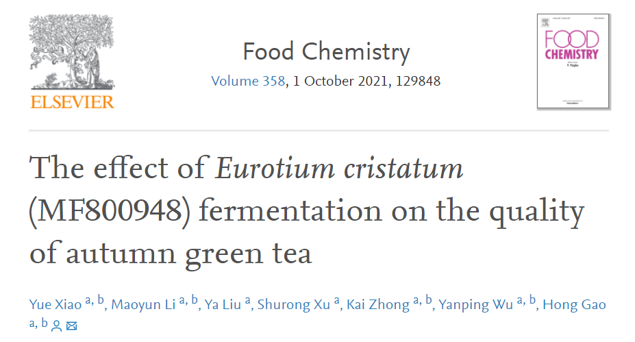近日,我院高鸿教授团队以秋茶为原料,利用专利菌株“冠突散囊菌PW-1”进行秋茶发酵,探究冠突散囊菌PW-1菌株对黑茶品质的提升作用及机制,相关研究成果以我院为第一单位发表在食品科技领域顶级期刊《Food Chemistry》上,题为“The effect of Eurotium cristatum (MF800948) fermentation on the quality of autumn green tea”。我院博士研究生肖月为第一作者,高鸿教授为通讯作者,该项目获得了四川省科技计划项目基金(No. 20ZDYF3186)的支持。