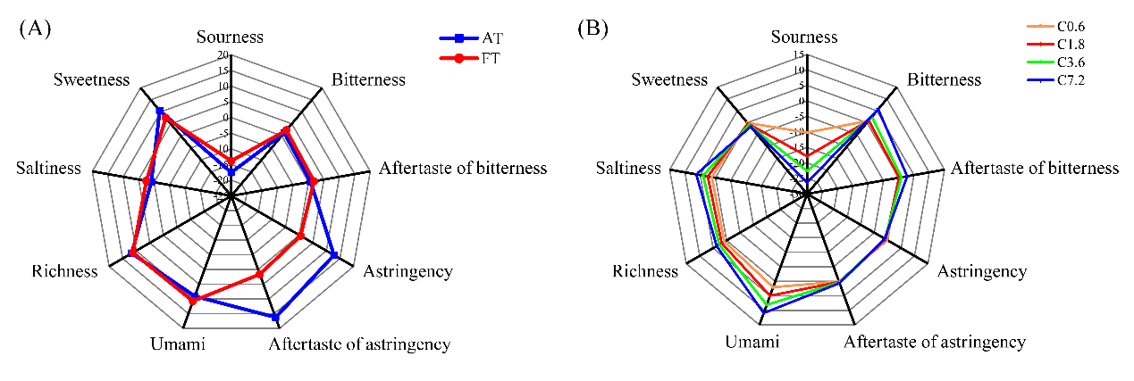 儿茶素,尤其是表没食子儿茶素没食子酸酯(EGCG)和表儿茶素没食子酸酯(ECG)是茶叶苦涩味的最主要来源。秋茶经冠突散囊菌PW-1发酵后,儿茶素总量从118.35 mg/g下降到10.58 mg/g,下降幅度达 91.06%;且发酵秋茶中酯化儿茶素EGCG和ECG的含量分别为0.37 mg/g和0.40 mg/g,表明菌株PW-1发酵可显著降低秋茶中的儿茶素含量。通过电子舌技术对秋茶和冠突散囊菌PW-1发酵秋茶的滋味特征进行分析,发现秋茶的涩味显著降低而鲜味强度有所增加,表明秋茶经菌株PW-1发酵后的滋味品质得到显著提高。此外,通过电子舌技术首次对茶褐素的滋味特征进行分析,发现茶褐素无涩味而呈强烈的鲜味,为发酵秋茶中的主要呈味物质。