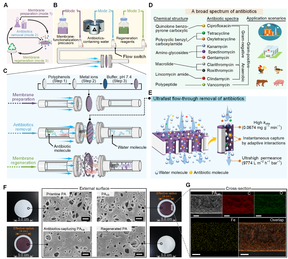 图1. 利用植物多酚与金属离子制备可再生(regenerable)的微孔吸附(adsorption)膜(PArab)的过程及其抗生素去除与循环再生图