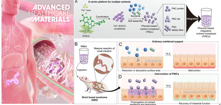 由于小肠切除所导致的短肠综合症(Short Bowel Syndrome,SBS)会使肠道营养有效吸收表面积减少。我院郭俊凌教授团队联合华西临床营养科胡雯教授团队,用绿茶多酚和亚铁离子构建一种营养物质递送的载体平台,通过与营养物质自组装,形成的多酚基营养复合物(phenolic-based integrative nutrient complex,PINC)能有效在肠道滞留,延长营养物质吸收时间。在SBS大鼠模型中,PINC可改善营养吸收状况,改善贫血和免疫功能,并促进剩余肠绒毛和隐窝的生长,维持肠道屏障的完整性。此外,PINC能调节肠道微生物,增加有益菌的丰度。此研究为多酚基纳米材料作为肠内营养的制剂奠定了理论基础,为SBS的治疗提供了营养支持和可行性策略。相关研究成果以题为“Self-assembled integrative nutrient carrier platform containing green tea catechin for short bowel syndrome treatment”的论文发表于Advanced Healthcare Materials,并被编辑部邀请作为当期封面论文(图一)。华西公共卫生学院2020级硕士研究生周正明为第一作者,我院郭俊凌教授和华西临床营养科主任胡雯教授为共同通讯作者,华西医院临床营养科石磊副教授、李可医生,以及我院何云翔副研究员(专职科研)参与论文指导和写作。