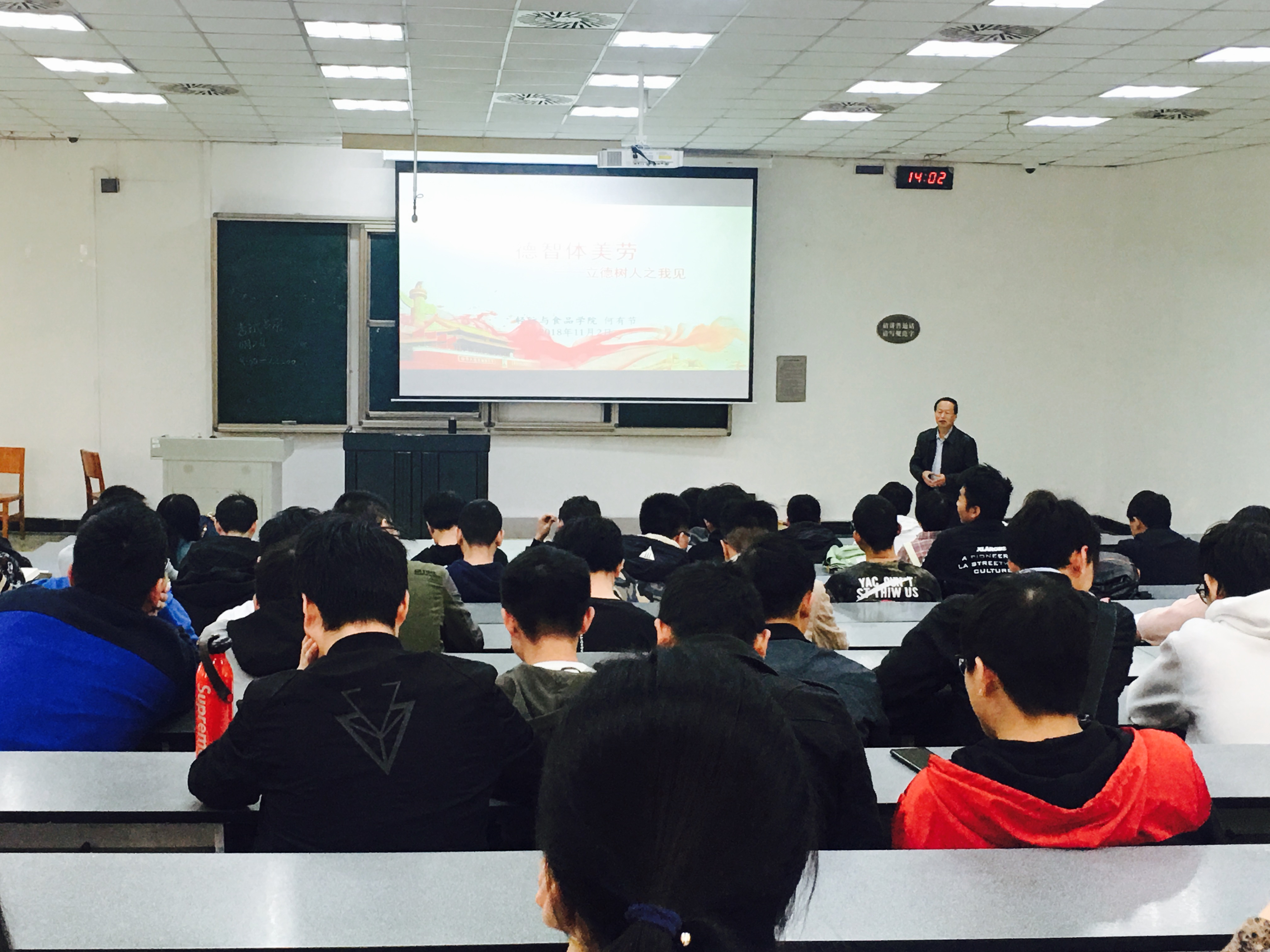 2018年11月2日下午,轻纺与食品学院院长何有节教授以“德智体美劳全面发展—立德树人之我见”为主题为我院2015级本科生讲授形势与政策课。本次课程由2015级辅导员贺婷老师主持,2015级全体本科生200余人参加了此次课程学习。