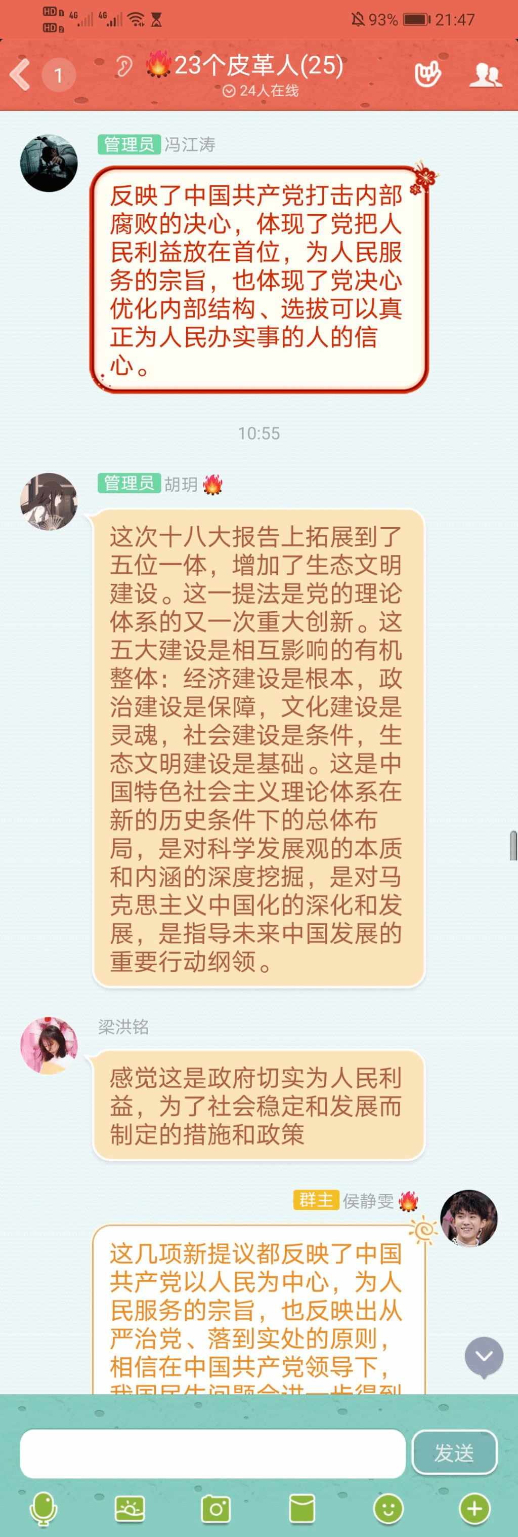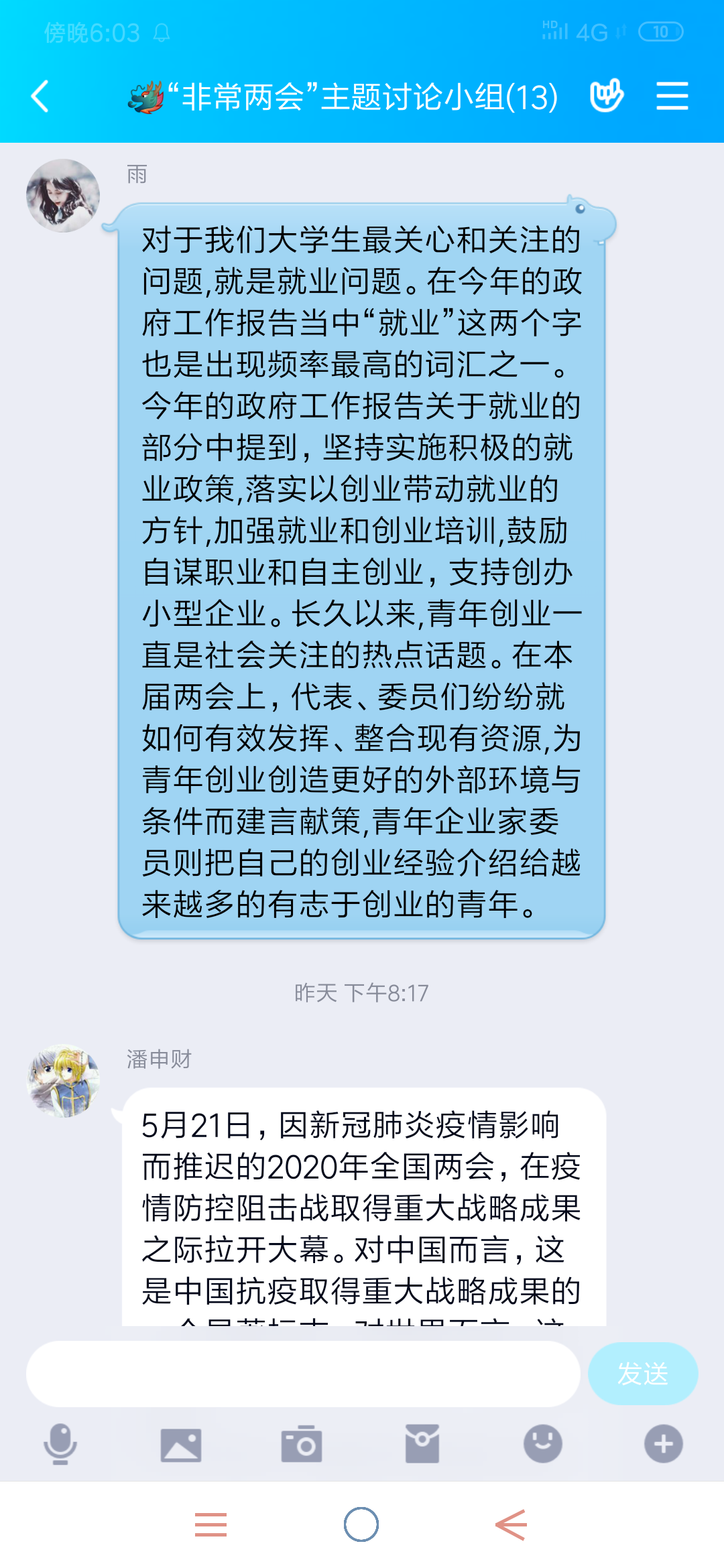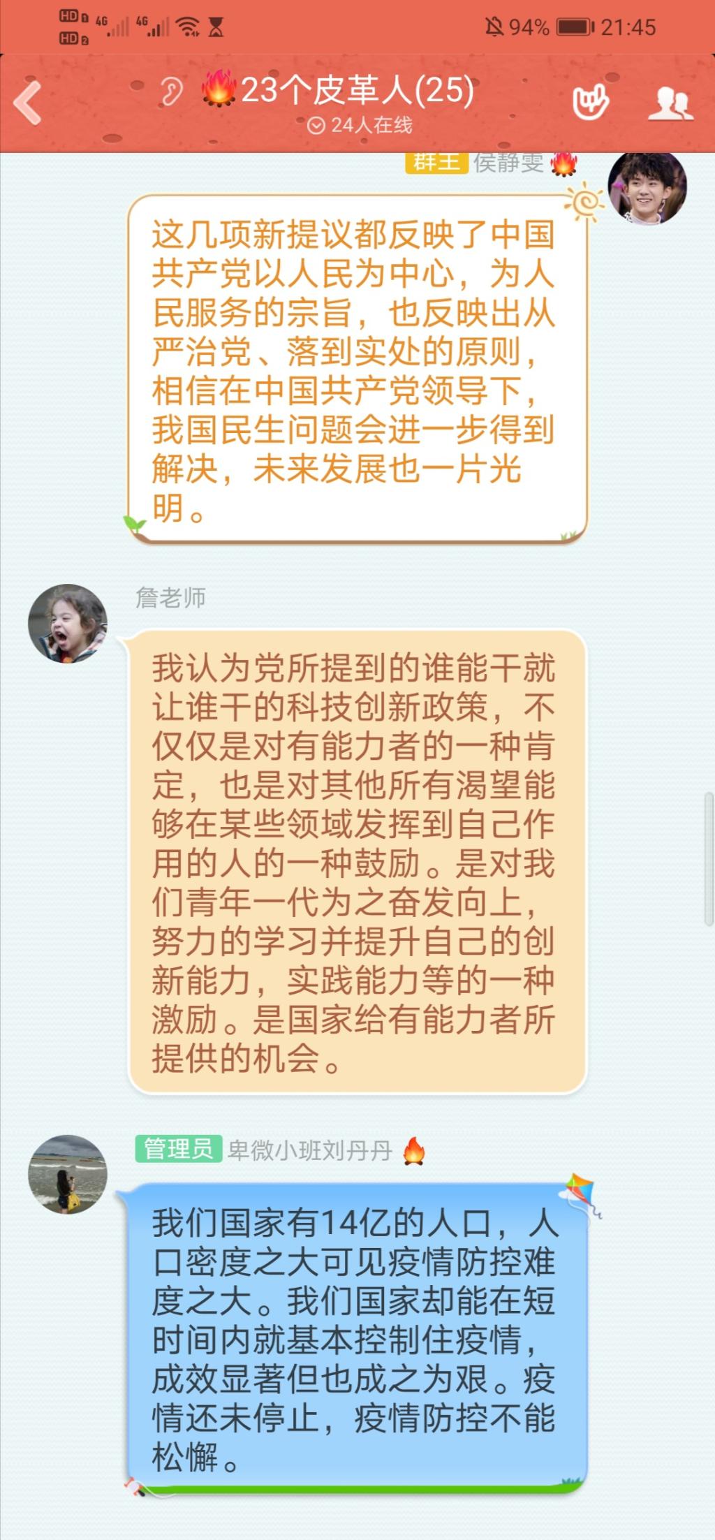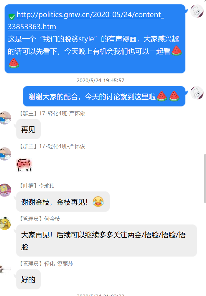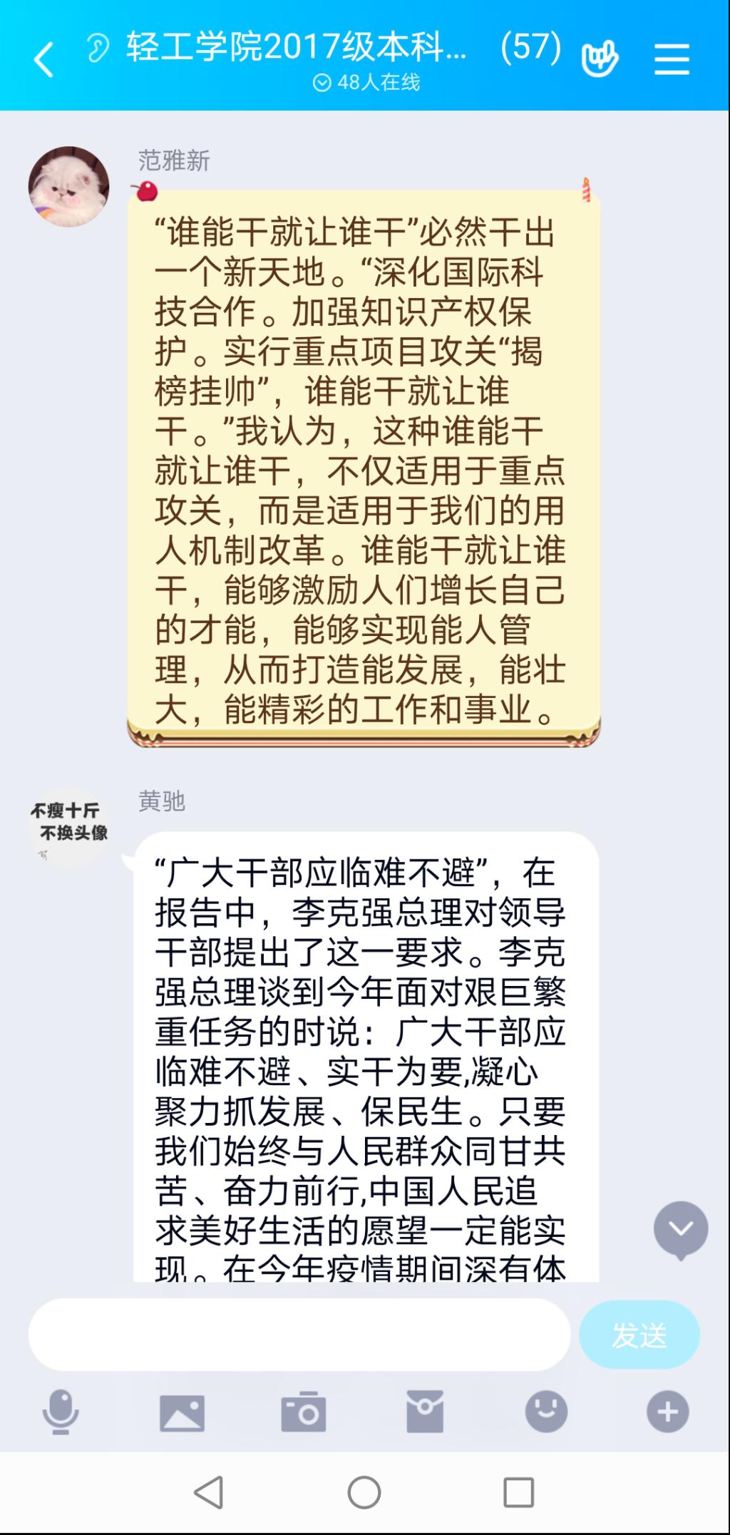 同时,学院各团支部通过专题团组织生活组织团员青年在线观看了两会相关视频,同学们热烈讨论、积极发表对两会的感想。同学们一致认为,今年两会的召开充分体现了“人民至上”、“生命至上”的原则,并深深感受到作为中国人的自豪;对建立健全香港法律法规体系,对《民法典》的出台均体会到国家治理体系与治理能力的日益完善;对“六保”、“六稳”政策、对脱贫攻坚的决心与信心,也感受到作为中国人民的幸福感与安全感。同时,同学们也深刻认识到一定要努力学习科学文化知识,提高个人本领,努力成长为可以担当时代大任的新一代青年。
