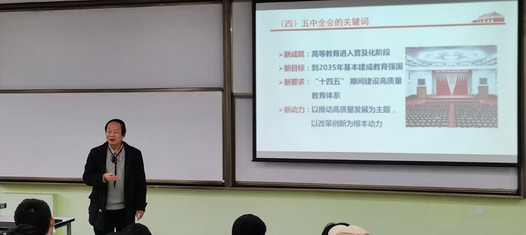 按照学校和学院关于书记、院长为学生上思想政治理论课的工作安排,结合十九届五中全会精神学习传达的工作实际,2020年12月11日下午,我院何有节院长在江安校区一教B103教室为2020级本科生讲授了专题党课。本次专题党课由辅导员余昕玲老师主持, 2020级全体学生参加了此次学习。