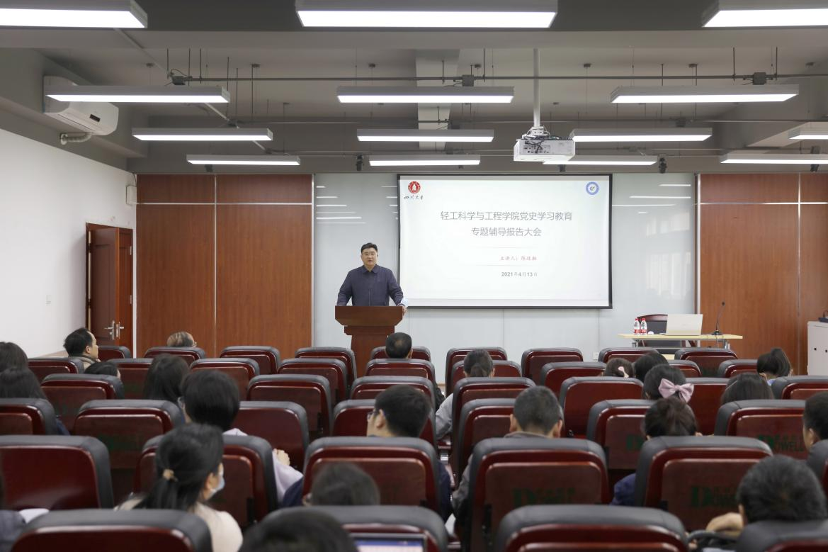 2021年4月13日,学院在皮革楼215报告厅组织召开党史学习教育专题辅导报告大会,邀请学校党史学习教育专家宣讲团成员陈廷湘教授作辅导报告。报告会由刘晓虎书记主持。