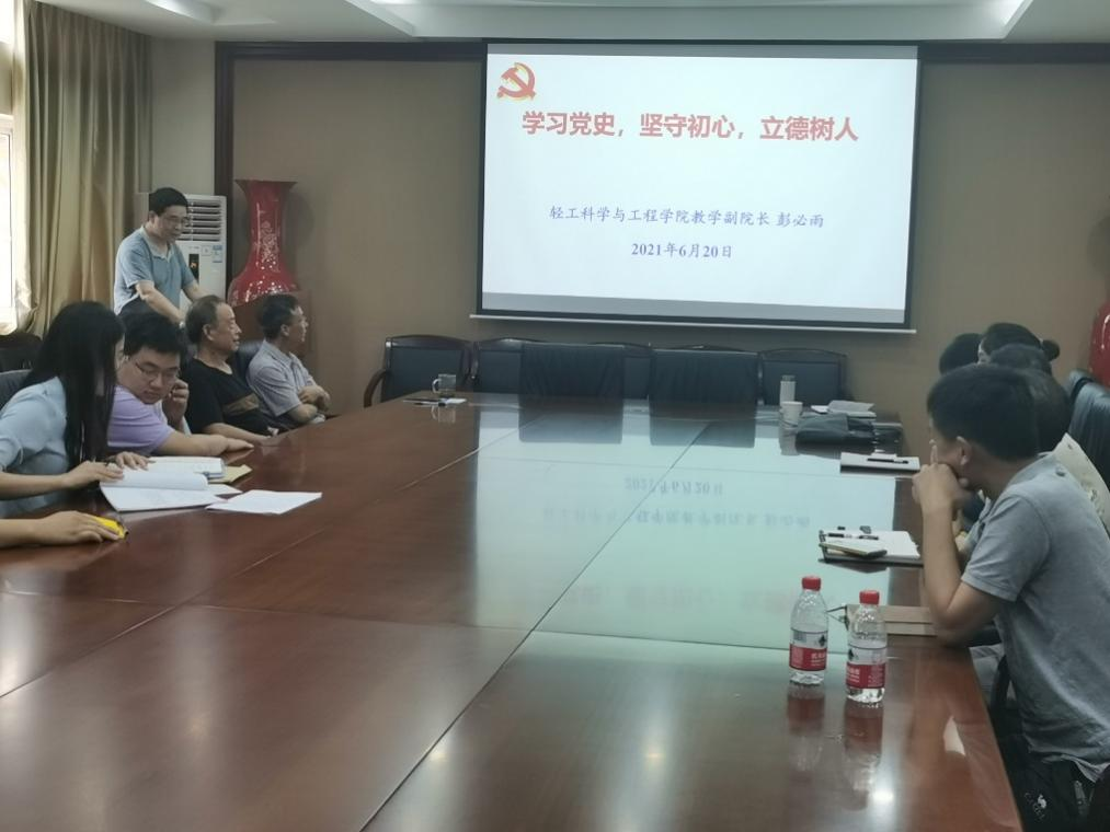 在庆祝中国共产党成立100周年之际,为进一步引导教职工开展党史学习教育,实现学史明理、学史增信、学史崇德、学史力行,切实做到学党史、悟思想、办实事、开新局,2021年6月29日下午,9428cn太阳集团古天乐彭必雨副院长为皮革教工党支部全体党员作了《学习党史,坚守初心,立德树人》的专题党课。
