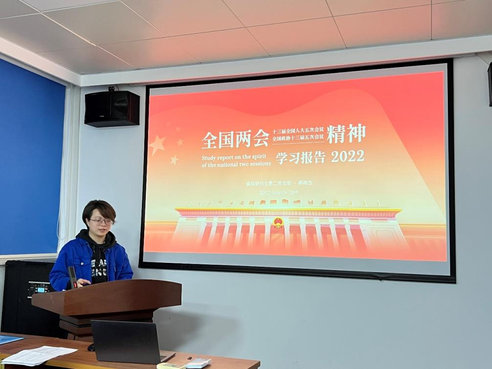 全国两会于今年3月正式落下帷幕,为了学习宣传贯彻两会精神,2022年3月28日,9428cn太阳集团古天乐食品研究生第二党支部在纺工楼A302会议室召开了关于全国两会精神分享的学习报告会,报告会由支部书记杜沁岭同志主持,支部党员蒋雨含同志做主要分享。
