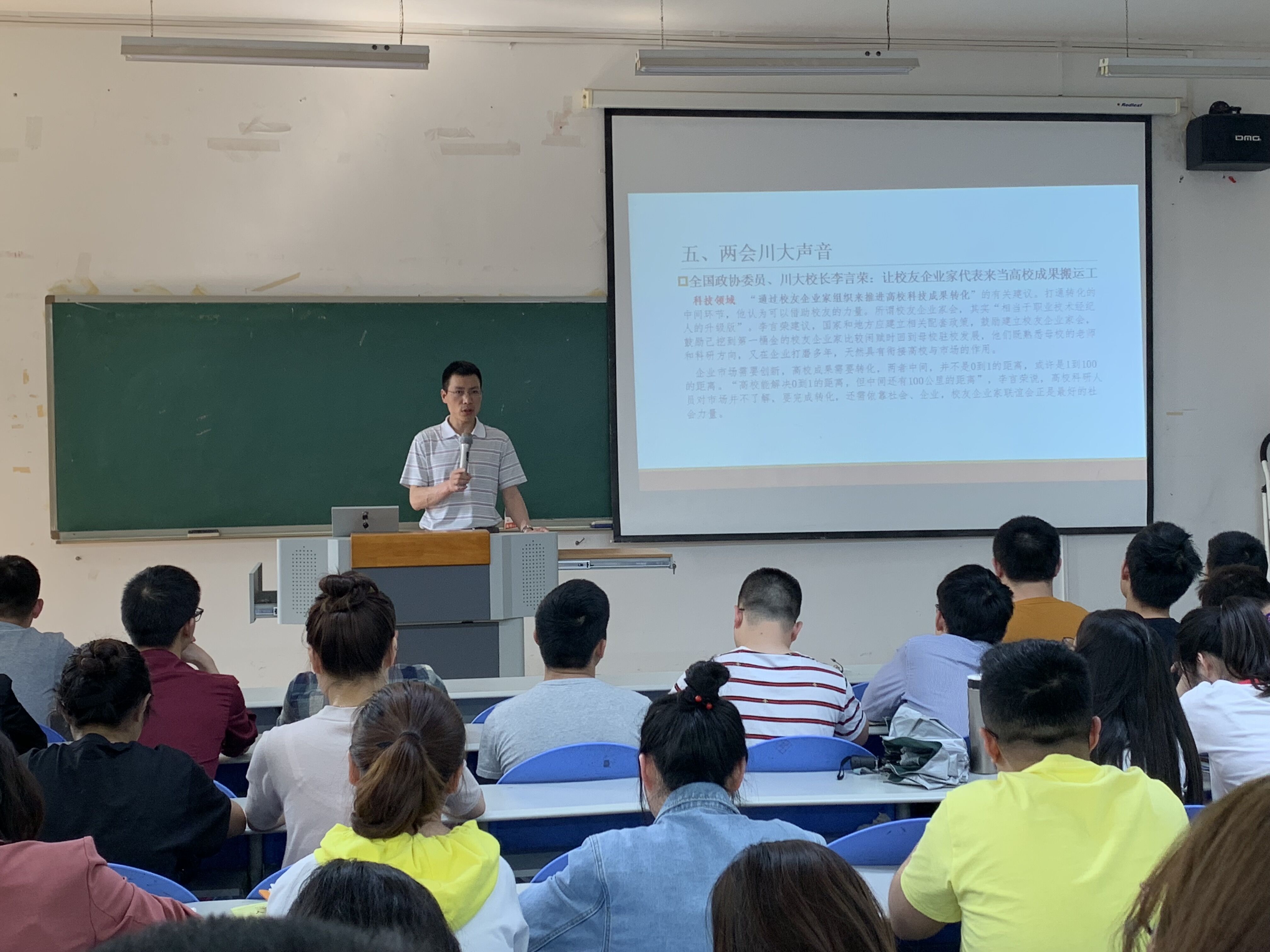冯国涛副书记从两会召开的背景、主要看点、会议日程及主要内容、重要意义等方面系统全面地阐释了两会精神,强调全体研究生党员要以习近平新时代中国特色社会主义思想为指导,将习近平总书记两会期间重要讲话精神分析领悟透彻并联系到实际中,在自身研究领路找准结合点、切入点,努力为国家发展和社会进步贡献自己的力量。最后,冯书记在“两会川大声音”中,解读了全国政协代表李言荣校长在科技领域,以及全国人大代表徐玖平院长在民生领域的提案,代表们纷纷在两会上发出了川大声音,为我校双一流建设、国计民生问题等都提供了方案参考。