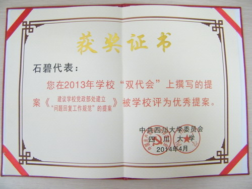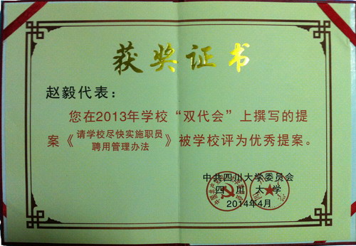 我院校双代会代表在四川大学2013年“双代会”(四川大学第三届教代会暨第二届工代会第三次)会议期间,广泛听取广大教职工的意见,认真履行代表的职责,积极共向大会提出5项提案。
