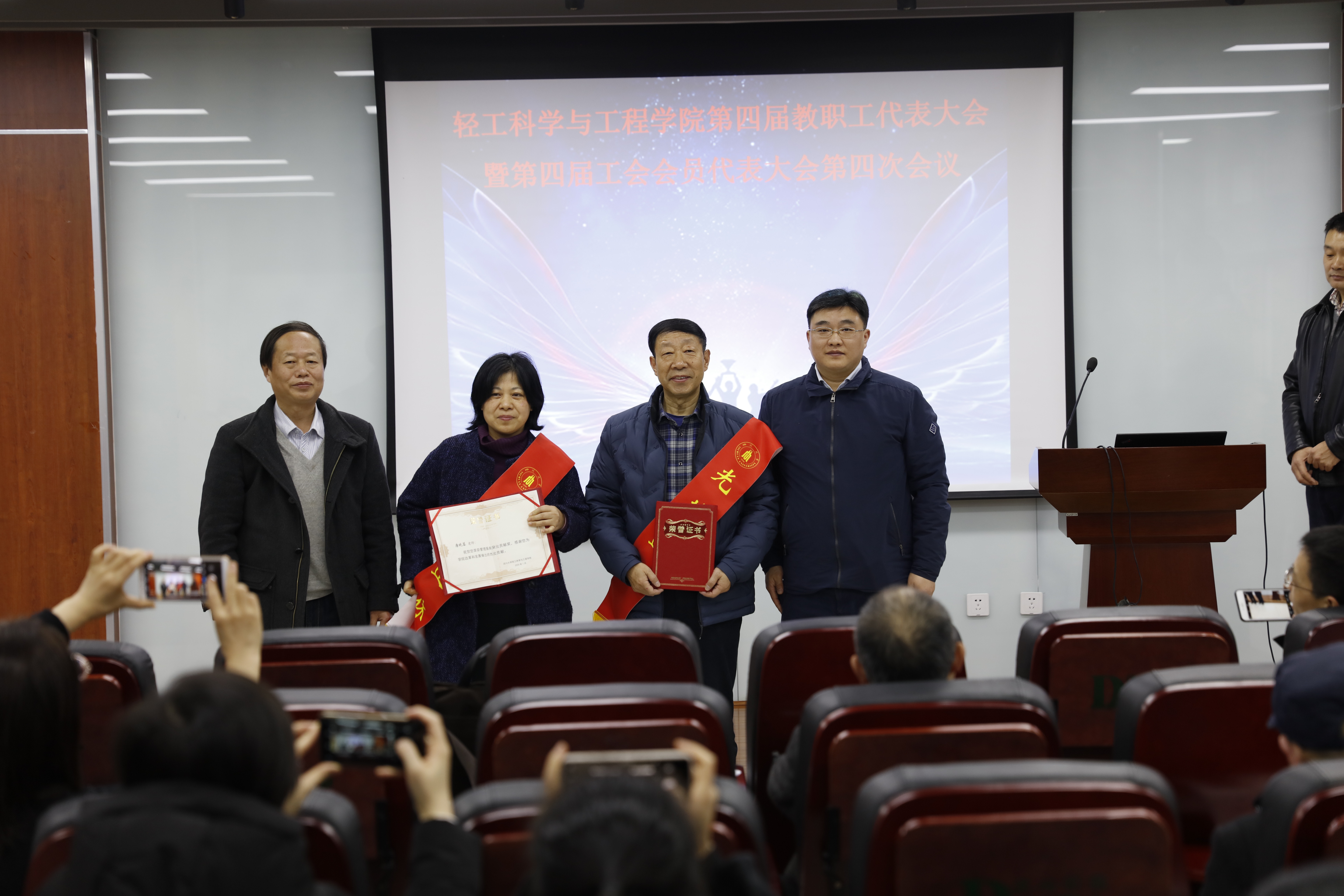 正式会议开始之前,举行了简短朴素的荣休仪式,体现薪火相传、继往开来的文化传承。2019年,学院有3位教职工光荣退休——国家级教学名师陈武勇教授、邱华军老师和唐晓蓉老师,学院的发展历程中,凝聚他们潜心教学科研,倾心管理服务和无私奉献,授予陈武勇教授“教学科研及管理服务突出贡献奖”,授予邱华军和唐晓蓉老师“管理服务突出贡献奖”,院党委书记刘晓虎同志和院长何有节同志为3位荣休教师颁发证书,披上绶带,感谢他们长期以来为学院改革发展所做的努力和奉献。