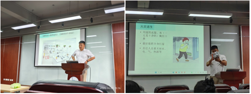 赵阳工程师根据本年度安全生产月主题,首先根据相关法律法规介绍了逃生通道、疏散通道的相关知识,并就常见的堵塞消防通道的问题及整改方案进行了讲解。随后,赵阳工程师结合具体火灾案例,阐述了堵塞消防通道的危害。最后,赵阳工程师结合我院楼栋实际情况,讲解了应急逃生的基本技巧,并现场演示了消防面罩的使用方法。