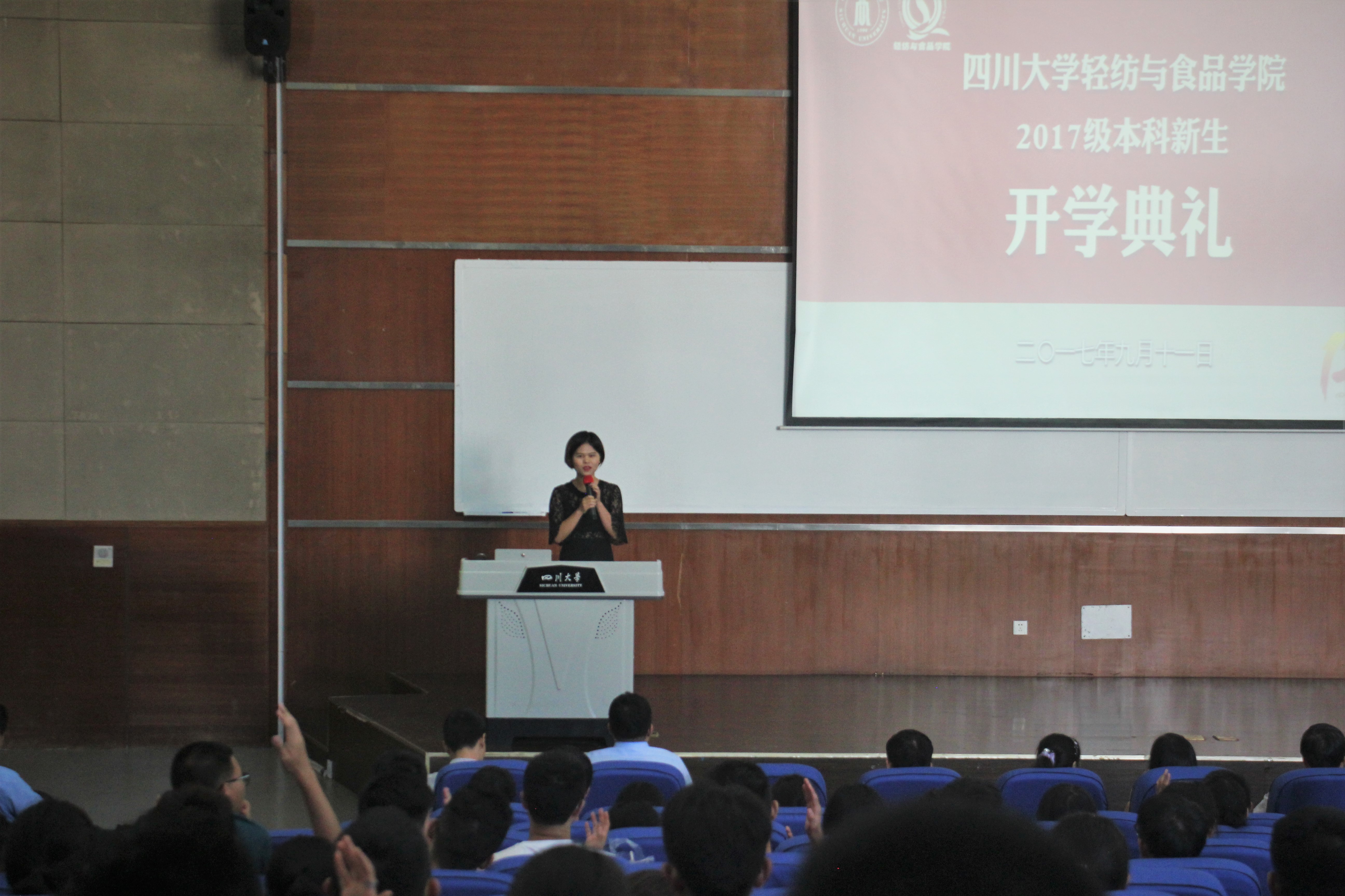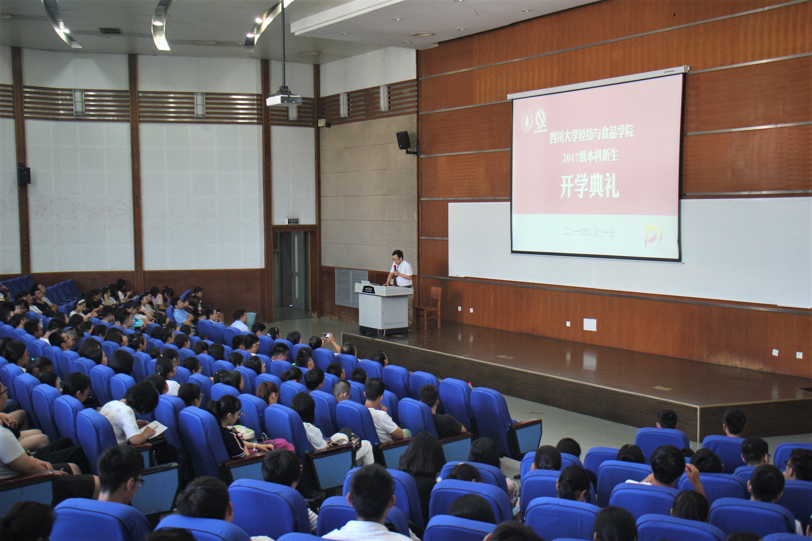 2017年9月11日,轻纺与食品学院2017级本科新生开学典礼暨入学教育大会在四川大学江安校区综合楼C407顺利举行。党委书记刘晓虎副教授,院长何有节教授,副院长兰建武教授,副院长何强教授,院长助理、纺织与服装工程系副系主任郭荣辉副教授,纺织与服装工程系副系主任申鸿副教授,教师代表王海波副教授,教导员吕振生老师,学生科科长冯国涛老师,院团委书记苏德强老师,17级辅导员向星烨老师、李杨老师以及全体2017级本科新生参加了本次活动。开学典礼由刘晓虎书记主持。