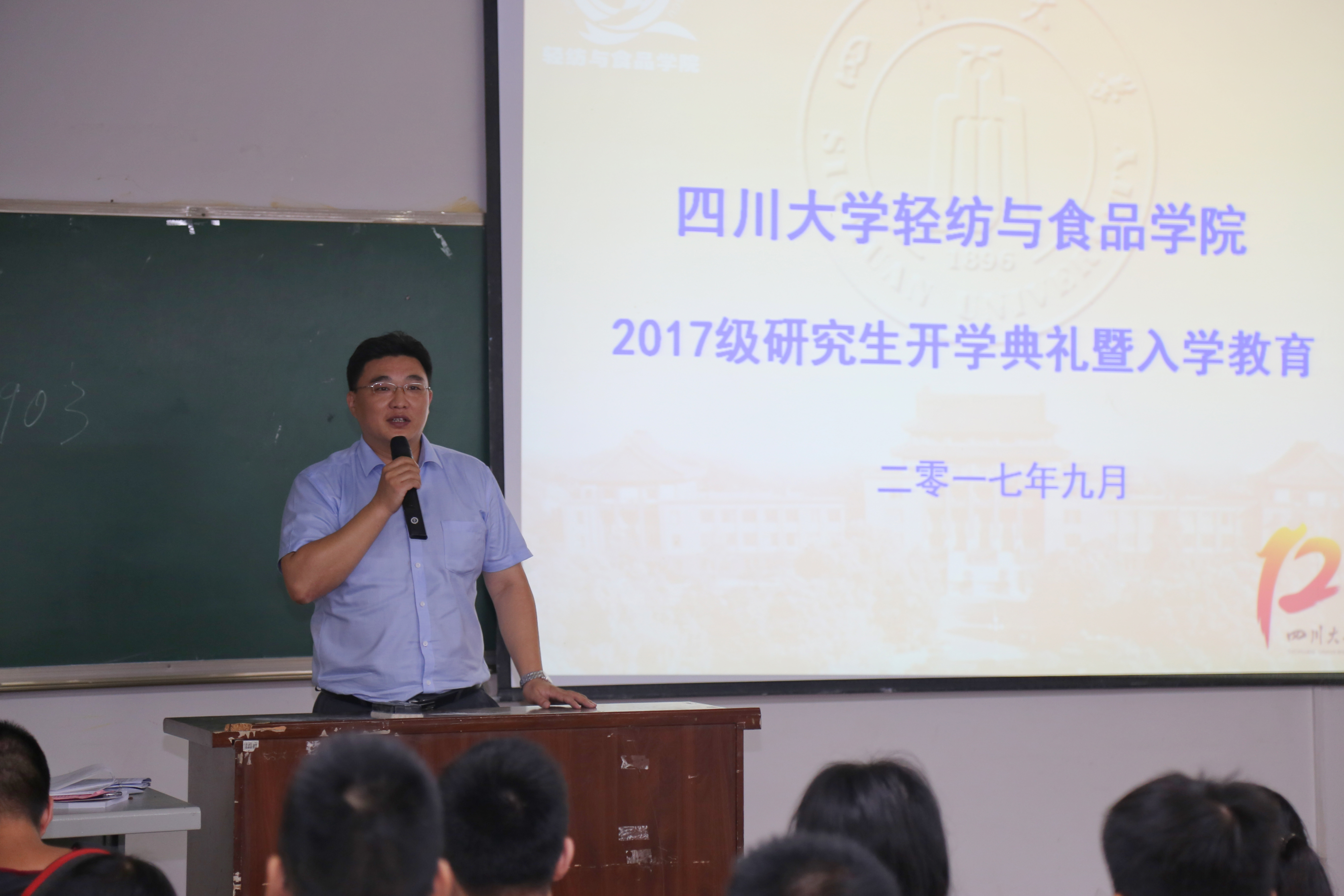 2017年9月14日9:00,四川大学轻纺与食品学院2017级研究生开学典礼暨入学教育在纺工附楼205隆重举行。参加本次开学典礼的有学院党委书记刘晓虎副教授、院长何有节教授、生物质与皮革工程系副系主任林炜教授、食品工程系副系主任高鸿教授、纺织与服装工程系副系主任郭荣辉副教授、研究生教务员邓莎老师以及2017级全体研究生新同学。开学典礼由院学生科科长、研究生辅导员冯国涛老师主持。
