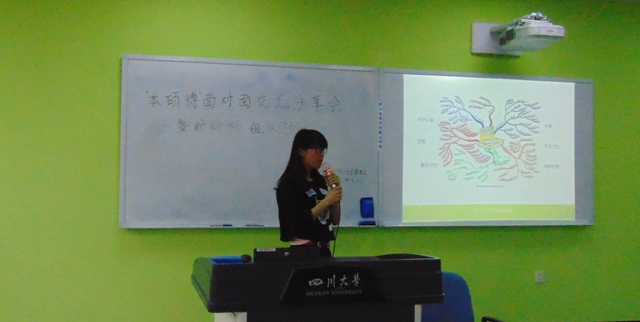 2015年4月18日14点, “盼盼食品杯”食品创意大赛本硕博面对面交流分享会暨现场组队沙龙在四川大学江安校区综合楼B305教室顺利开展。本次活动由我院竞赛部主办。2012级皮革专业博士丁翠翠同学,2014级食品专业硕士周航同学和2014级服装专业硕士魏丰然同学作为嘉宾参加了本次交流分享会。