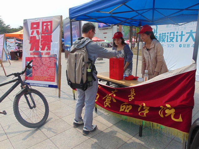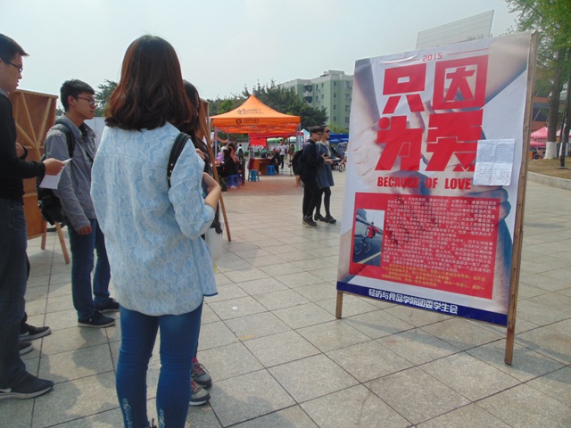2014年3月30日,我院“只因为爱”现场募捐活动在四川大学江安校区青春广场顺利举行。本次活动由轻纺与食品学院团委学生会主办。我院“星原”志愿者服务队的志愿者们以及2013级轻化工程二班的同学们积极组织了本次募捐活动。