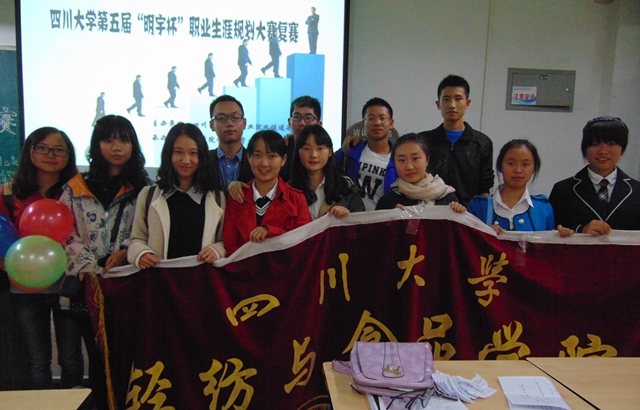 2014年10月14日19:00,第五届“明宇杯”职业生涯规划大赛复赛在四川大学江安校区第一教学楼A教A613教室顺利召开。此次大赛由四川大学团委创业就业促进部主办,轻纺与食品学院创业就业促进部与商学院创业就业促进部共同承办。到场的嘉宾评委有四川大学招生就业工作处马亚婧老师,我院团委副书记李晓秀老师,商学院2011级学生会主席、四川大学联合利华俱乐部副主席高晓昂同学。