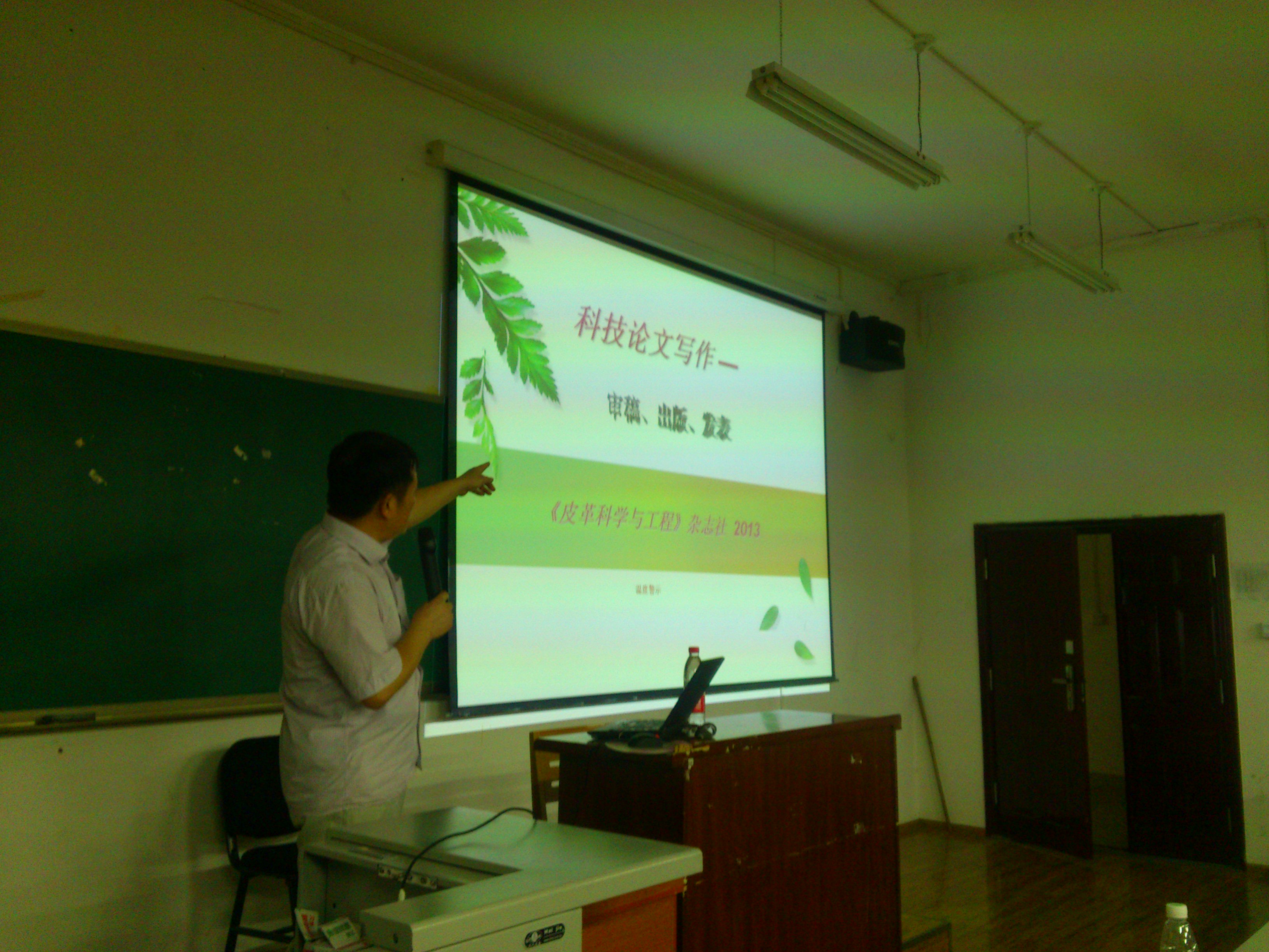 按照学校研究生院学术道德与学术规范教育的总体要求,为了更加规范科技论文论文的写作,我院于10月11日晚19点在纺工附楼205教室对2013级所有研究生新生进行了科技论文写作的专题讲座,本次讲座有幸邀请到《皮革科学与工程》杂志主编、《中国皮革》杂志编审单志华教授主讲。