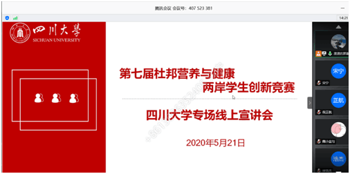 为进一步加强企业和高校的产学研结合,积极推进两岸食品产业发展,努力培养大学生的自主创新能力,在中国食品科学技术学会的带领下,在行业企业的支持下,第七届杜邦营养与健康两岸学生创新竞赛如期举行。因受疫情防控影响,本次杜邦营养与健康两岸学生创新竞赛四川大学专场宣讲会于5月21日下午在腾讯会议平台线上开展。