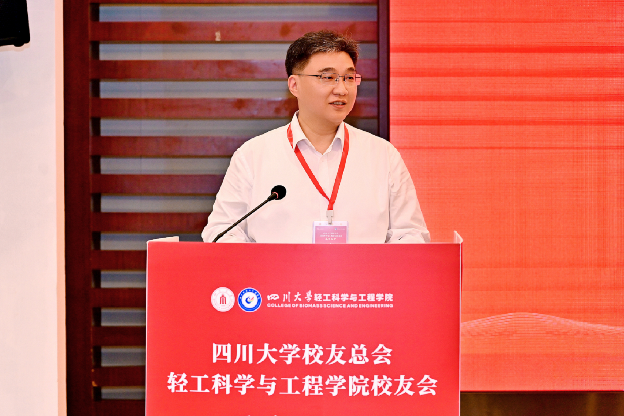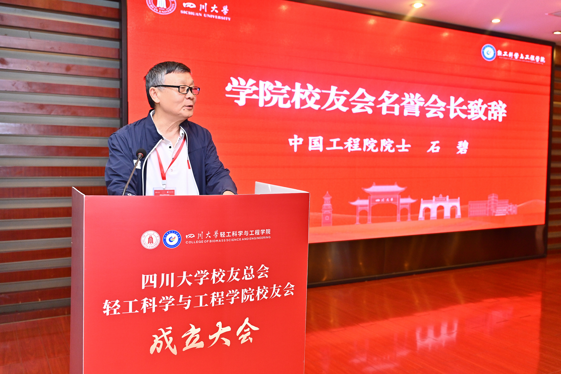 学院校友会名誉会长石碧院士致辞,他表示学院的发展离不开每一位校友的参与,校友会将成为母院与校友之间一个开放、包容、共享的平台,希望校友们继续发扬“海纳百川,有容乃大”的川大精神助力学院发展,祝愿校友会蓬勃发展,祝愿各位校友前程似锦。