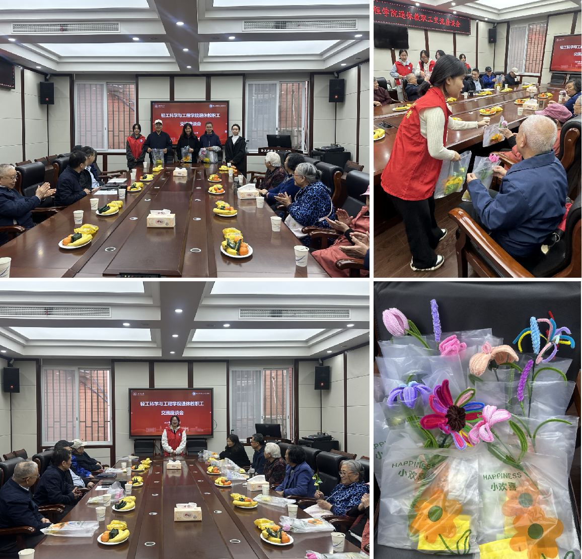 会上,彭必雨院长首先向全体退休教职工致以诚挚的重阳节问候与美好祝愿。他通报了学院在人才培养、科学研究、社会服务等方面的最新成果,特别感谢老同志们为学院建设打下的坚实基础,以及长期以来对学院发展的牵挂与支持。随后,学生志愿者代表手捧亲手制作的手工花束,逐一送到退休教师手中,现场暖意融融。
