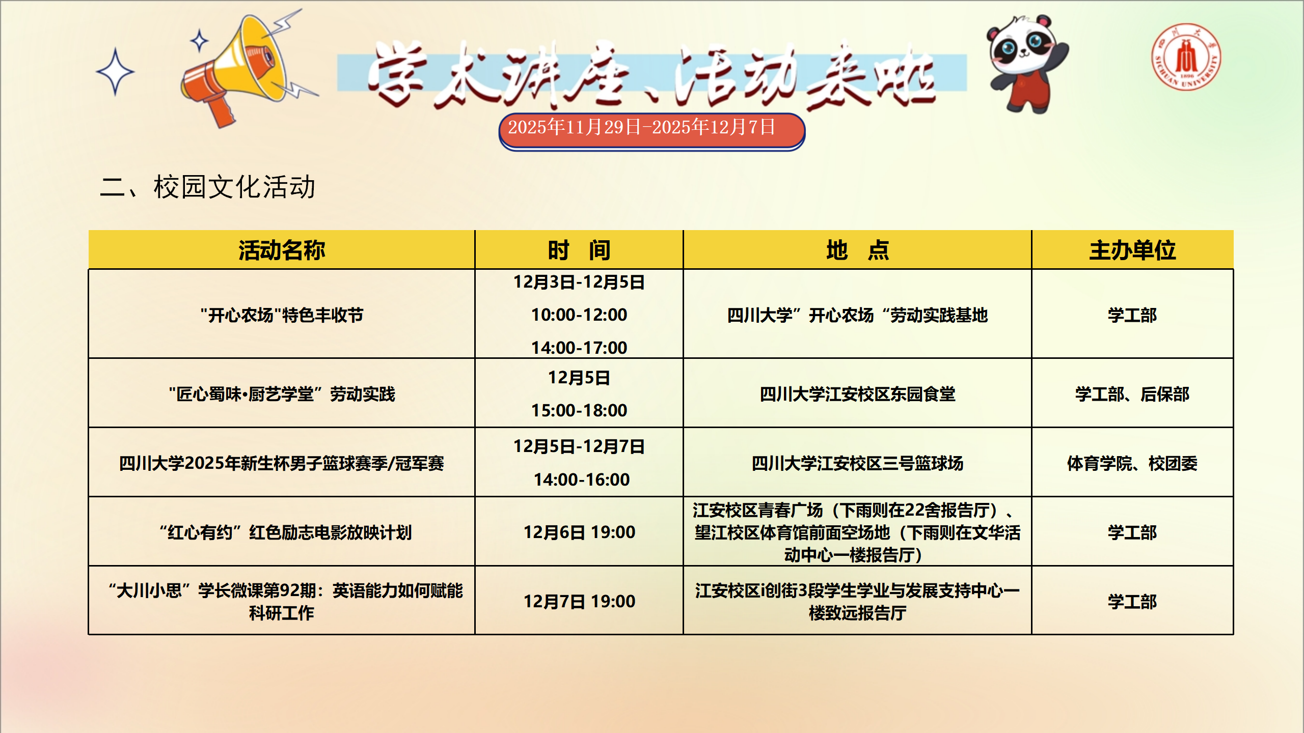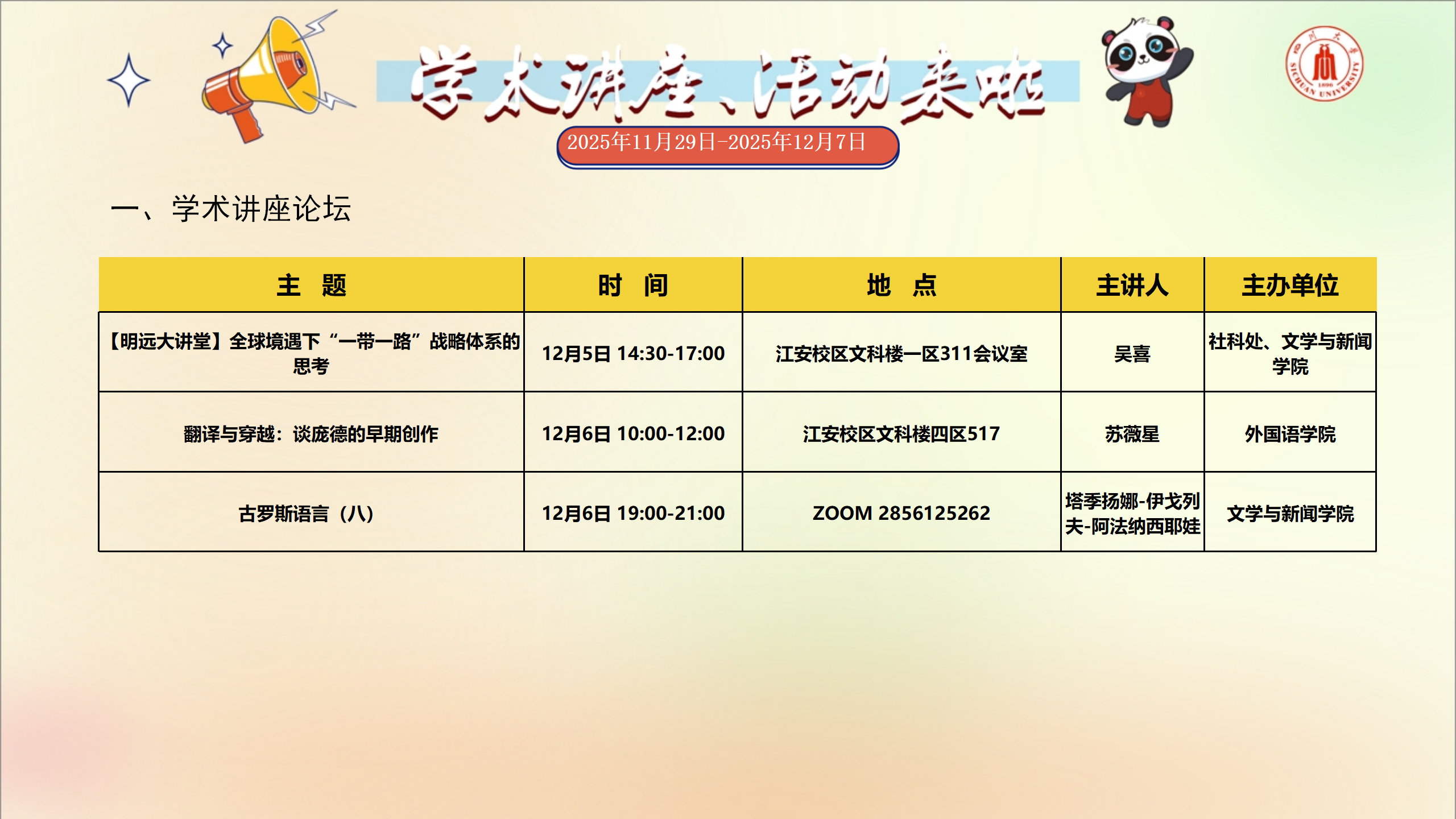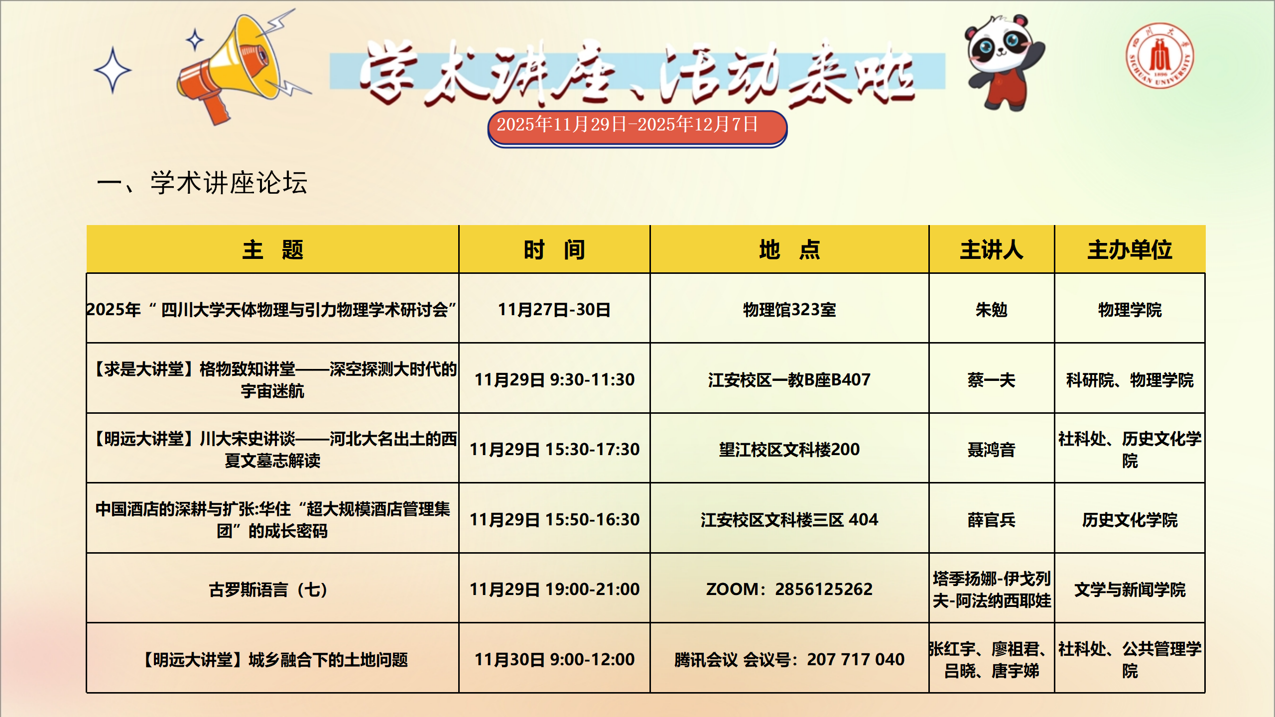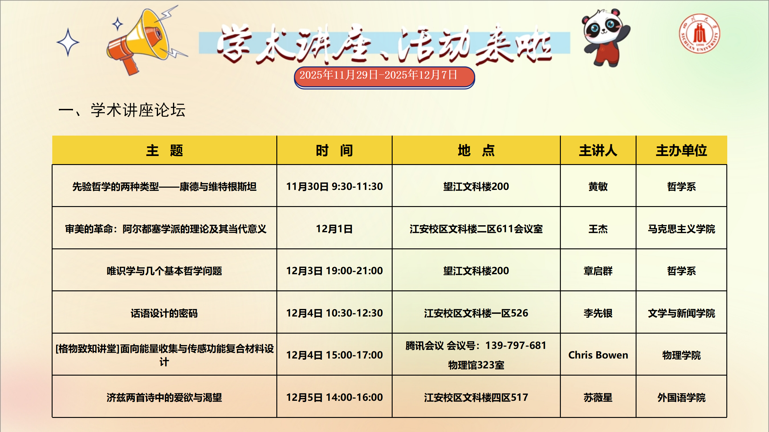 学术讲座和校园文化活动预告(2025年11月29日-2025年12月7日)