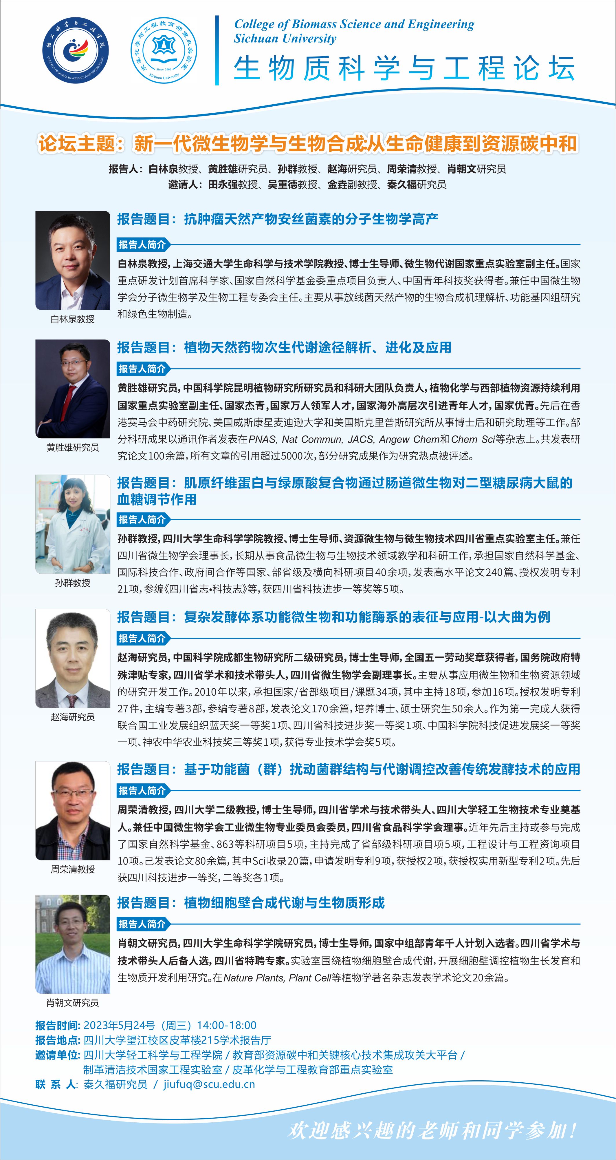 生物质科学与工程论坛:白林泉教授、黄胜雄研究员、孙群教授、赵海研究员、周荣清教授、肖朝文研究员 学术报告