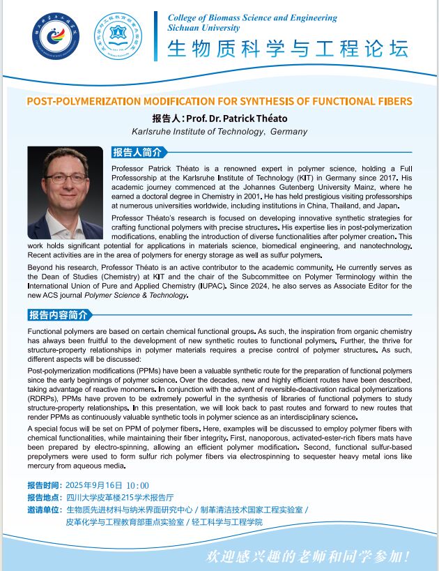 生物质科学与工程论坛:Patrick Théato教授 学术报告
