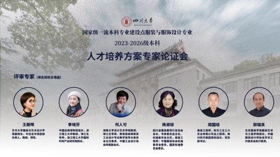 出席本次会议的论证专家有:东华大学服装与艺术设计学院副院长王朝晖教授、中国丝绸博物馆馆长季晓芬教授、教育部高等教育工业设计专业教学指导分委员会主任委员何人可教授、四川省服装服饰行业协会杨淑琼会长、际华三五三六实业有限公司周国培总工程师、北京服装学院服装艺术与工程学院院长郭瑞良教授;参加本次论证会的校内人员有:彭必雨院长、陈意副院长、杨璐铭教授、申鸿副教授、祝蔚老师、刘健西老师、时昱老师、王巍老师、廖勇老师、孟虎老师等。