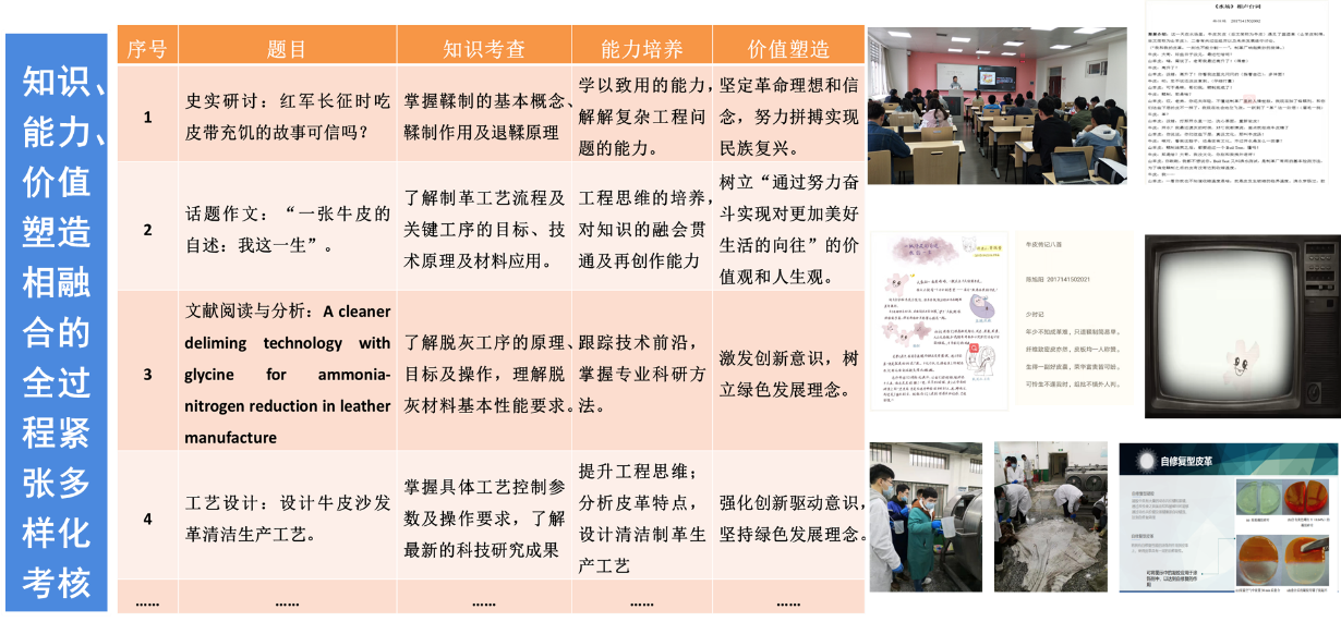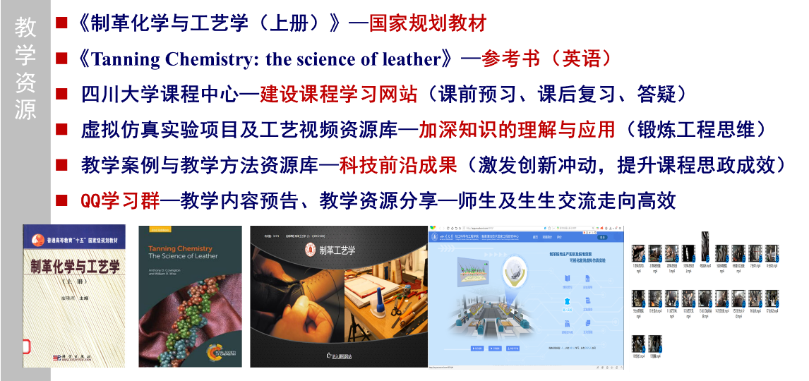 开展课程教学内容的系统重构。将科技前沿成果融入课程。针对知识更新滞后的问题,建设以行业科技发展的新理论、新技术为主的教学案例库,提升教学内容的前沿性和时代性。积极利用现代信息手段丰富课程教学资源,先后建成了《制革工艺学》线上课程平台;《制革脱毛生产实训及脱毛效果可视化监测虚拟仿真实验项目》;可视化制革工艺教学视频库等。经过多年的发展,已经建成了以国家规划教材为基础的、虚实结合、线上线下融合的教学资源体系;为丰富教学方法奠定了基础,并为提高学生对工程认知提供了工具。