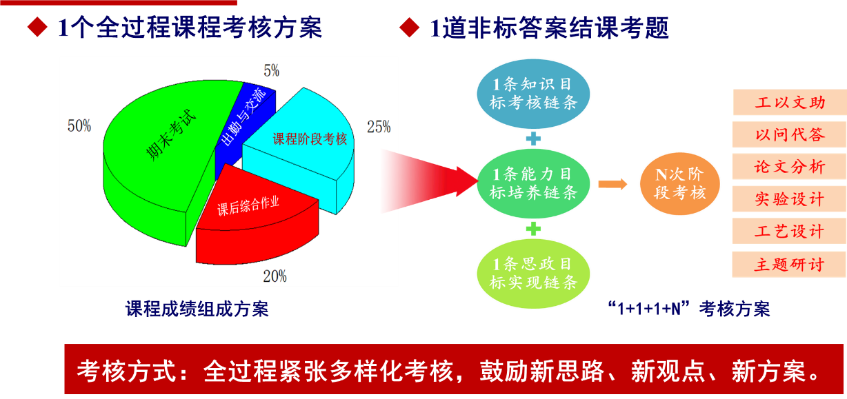 针对考核方法单一、产出标准不严等问题,系统优化学习评价方法,从一考定终身的传统期末考试,拓展到自主学习、持续学习和适应发展的全过程考核,初步形成了“1+1+N”的全过程课程考核方案设计原则。在过程性考核中,设计了比较多的非标准答案主观性考题,特别注重知识、能力、价值导向的融合考查,提高课程的挑战度。