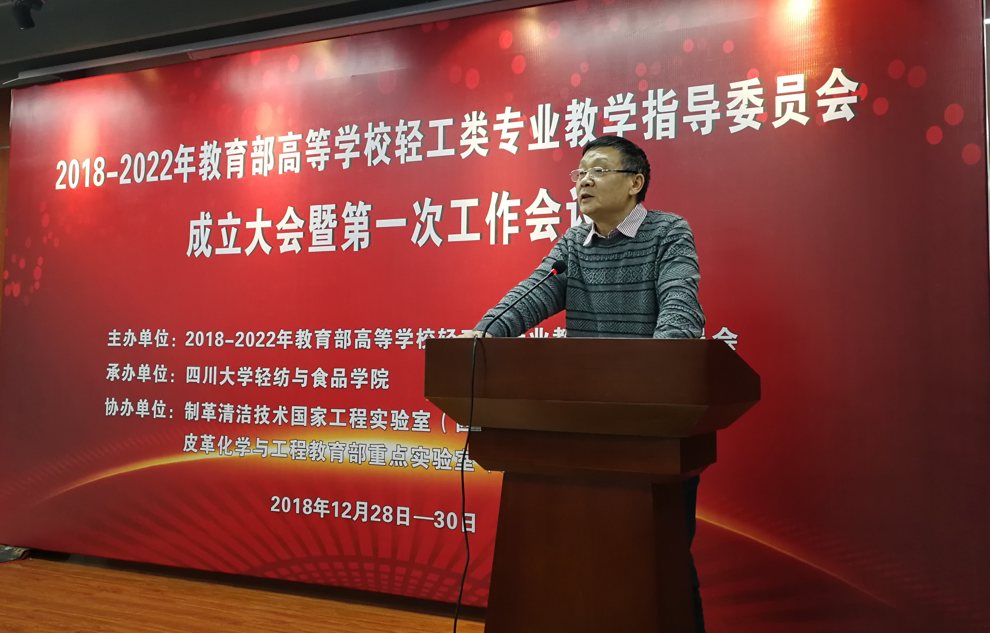 为全面贯彻落实全国教育大会精神、新时代全国高等学校本科教育工作会议和教育部2018-2022年高等学校教学指导委员会成立会议精神,研讨筹划轻工类教指委工作,2018年12月28日至30日,由“教育部高等学校轻工类专业教学指导委员会”主办,四川大学轻纺与食品学院承办,制革清洁技术国家工程实验室和皮革化学与工程教育部重点实验室协办,“2018-2022年教育部高等学校轻工类专业教学指导委员会(以下简称“轻工类教指委”)成立大会暨第一次工作会议”在四川大学(四川成都)隆重召开。