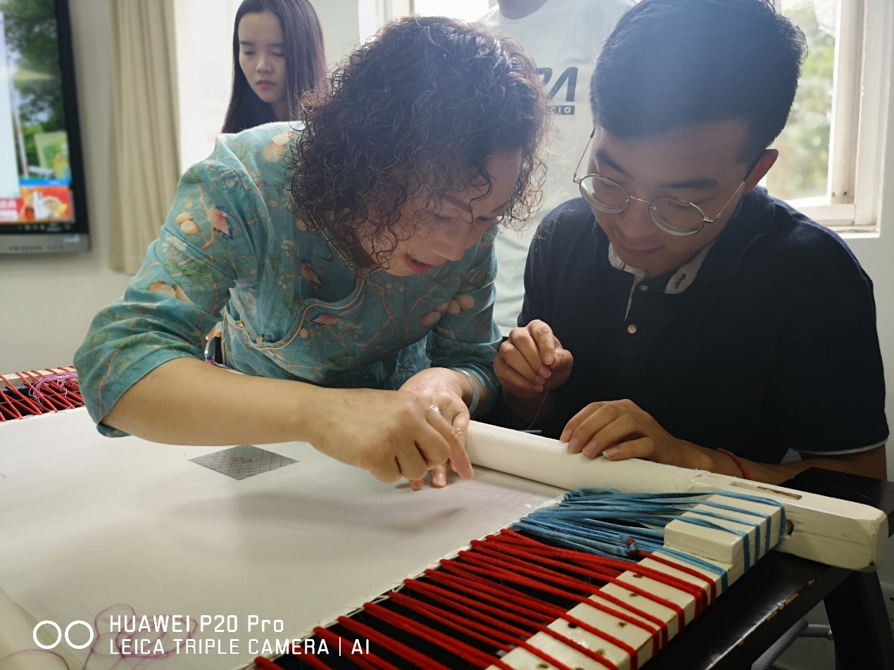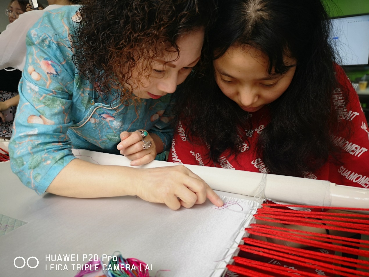 本次班会邀请了四川省蜀绣“非遗”传承大师吴玉英女士亲临现场,为同学们现场讲解了蜀绣衣锦纹针的历史及特点,并现场演示了蜀绣衣锦纹的刺绣针法。同学们对蜀绣这一“非遗”传承表现出了极大的热情,现场气氛热烈,纷纷体验了衣锦纹针法的刺绣过程,吴老师对同学们进行了一一指导。