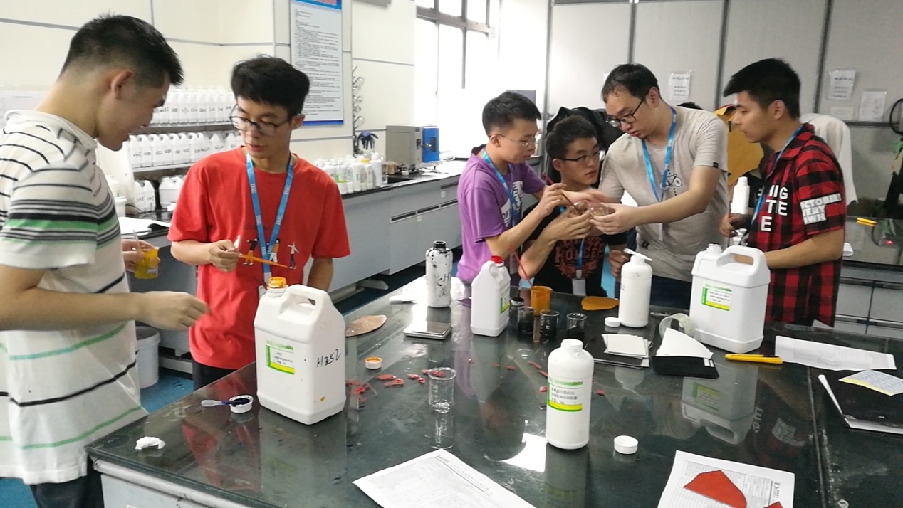 本次实习分为涂饰实习和水场实习两个阶段。涂饰实习阶段时间为7月19日至8月2日,由上海金狮化工有限公司李梅芳、唐勇、孙海桀和郭姿姿等工程师进行现场指导,分别介绍了涂饰中常用化工材料的性质和特点、常用机械设备的性能和使用。此阶段,在企业工程师指导下,实习队完成了六种常见皮革的涂饰操作。水场实习阶段时间为8月3日至8月15日,由上海金狮化工有限公司郭永彪、苏航等工程师指导,实习师生完成了头层牛皮鞋面革和牛二层鞋面革的水场工序操作,在此阶段,实习队还进行了浸灰工序研发材料的应用对比。8月16日,实习队向企业导师和人力资源部门代表进行了实习汇报总结。