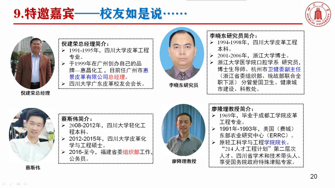 为了让2019级同学充分了解轻化工程专业的发展历史与现状、深刻理解专业内涵、增强专业自信,本次活动特别邀请了四川大学广东皮革校友会倪建荣会长(成都科技大学91级皮革工程专业)、浙江大学医学院口腔学系李晓东研究员(四川联合大学94级皮革工程专业)、福建省组织部蔡斯伟(四川大学08级轻化工程专业)和四川大学原9428cn太阳集团古天乐院长廖隆理教授(成都工学院64级皮革工程专业)等四位系友嘉宾进行专业分享。