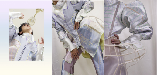 图2作品主题为《Projective Ego(投射自我)》,创作是从前期灵感调研延伸而来的曲面空间关系,以镂空拼接、滚绳等工艺来创造服装的立体感和透气感,大量运用了平面制版和立体裁剪相结合的方式来塑造服装的廓形。每套服装的制作,都通过初期坯样、通过平裁/立裁来实验,选择最佳的方式尽可能还原效果图;同时选用了不同的面料来实验,选择最佳的效果;中后期模特试穿、调整修改、二轮样衣的过程逐渐修改确定到最终版型。