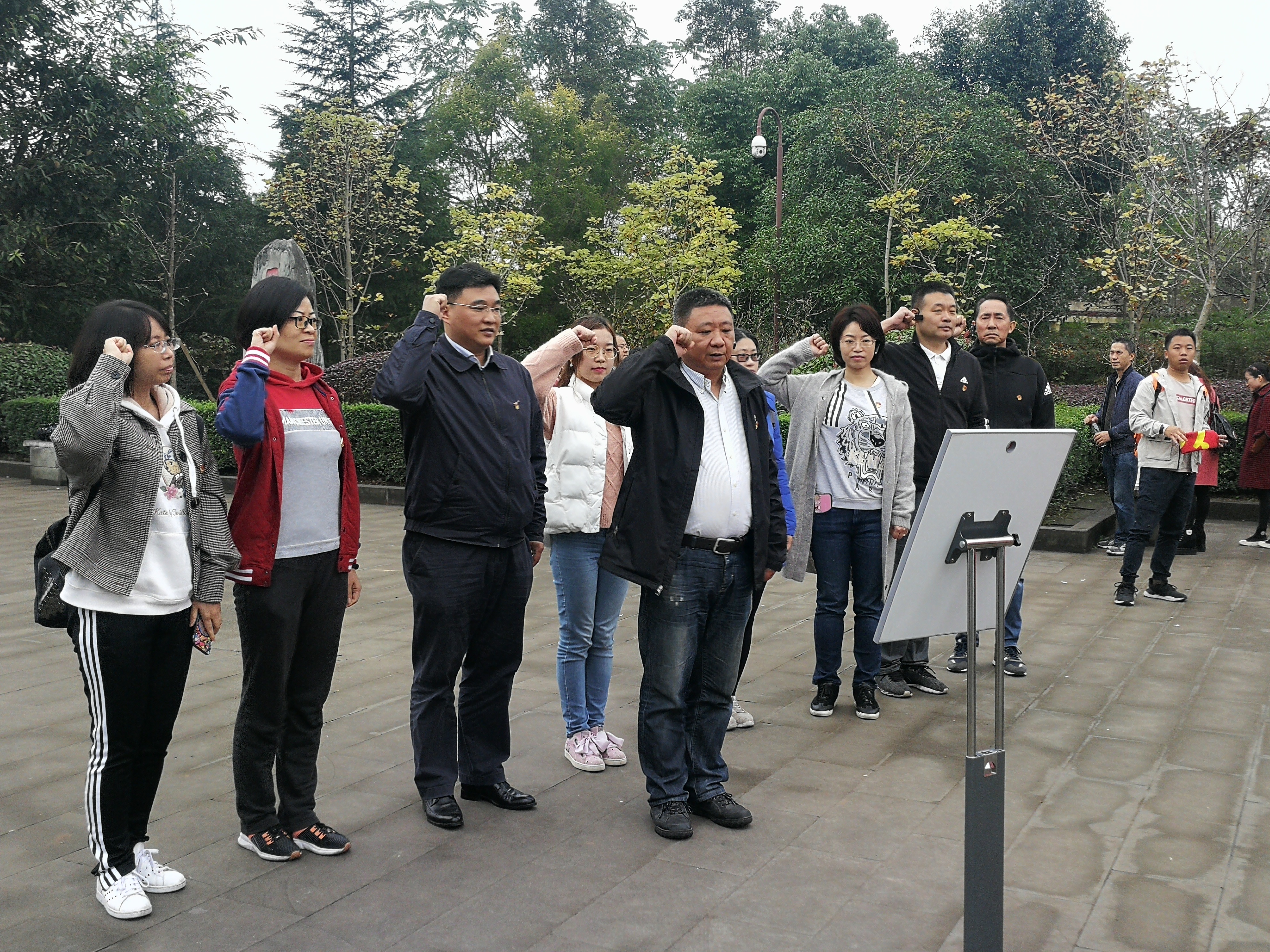 在讲解员的带领下,支部成员依次参观了黄桥决战浮雕、丹心广场、孟良崮战役浮雕、和平广场、陈毅生平事迹陈列馆和陈毅故居。每到一处,讲解员都详细讲述了相应的历史背景,使支部成员全方位地了解到陈毅元帅的生平和革命事迹。在丹心广场上,在由江泽民同志亲笔书题的“陈毅元帅”四个大字的陈毅元帅铜像前,全体党员重温了入党誓词。