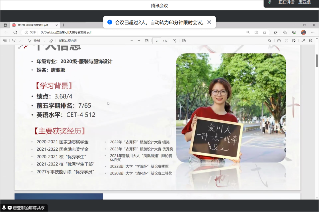 2023年7月4日,我院服装与服饰设计系通过腾讯会议在线平台顺利开展了2023年优秀大学生暑期夏令营活动。参加本次活动的人员有服装与服饰设计系主任杨璐铭教授、副主任申鸿副教授、教研室主任刘健西老师,本科生马裕宁、唐亚娜。