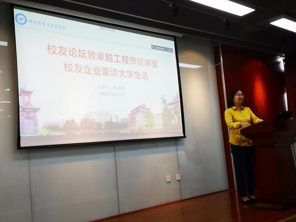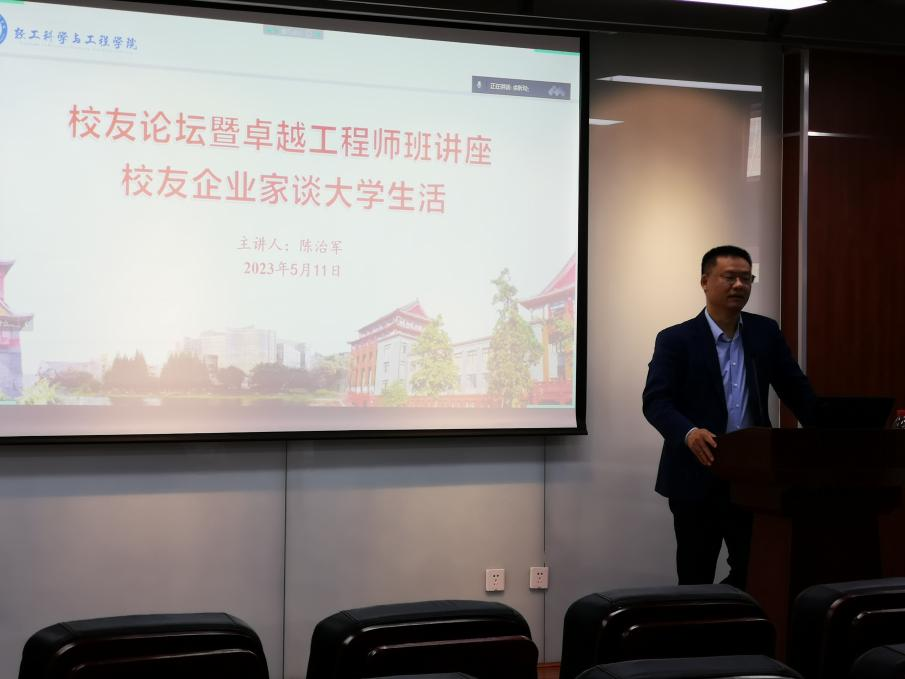 2023年5月11日下午15:00,轻化工程专业2019级卓越工程师班创新创业系列讲座在皮革楼215报告厅拉开帷幕。鸿丰高分子材料有限公司总经理陈志军为同学们做了《校友企业家谈校园生活》讲座。 2019级卓越工程师班本科生、学院党支部副书记冯国涛副教授、2020级辅导员余昕玲老师、任课教师何有节教授以及戴红副教授出席了本次讲座开讲仪式。